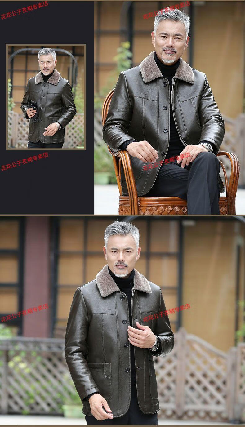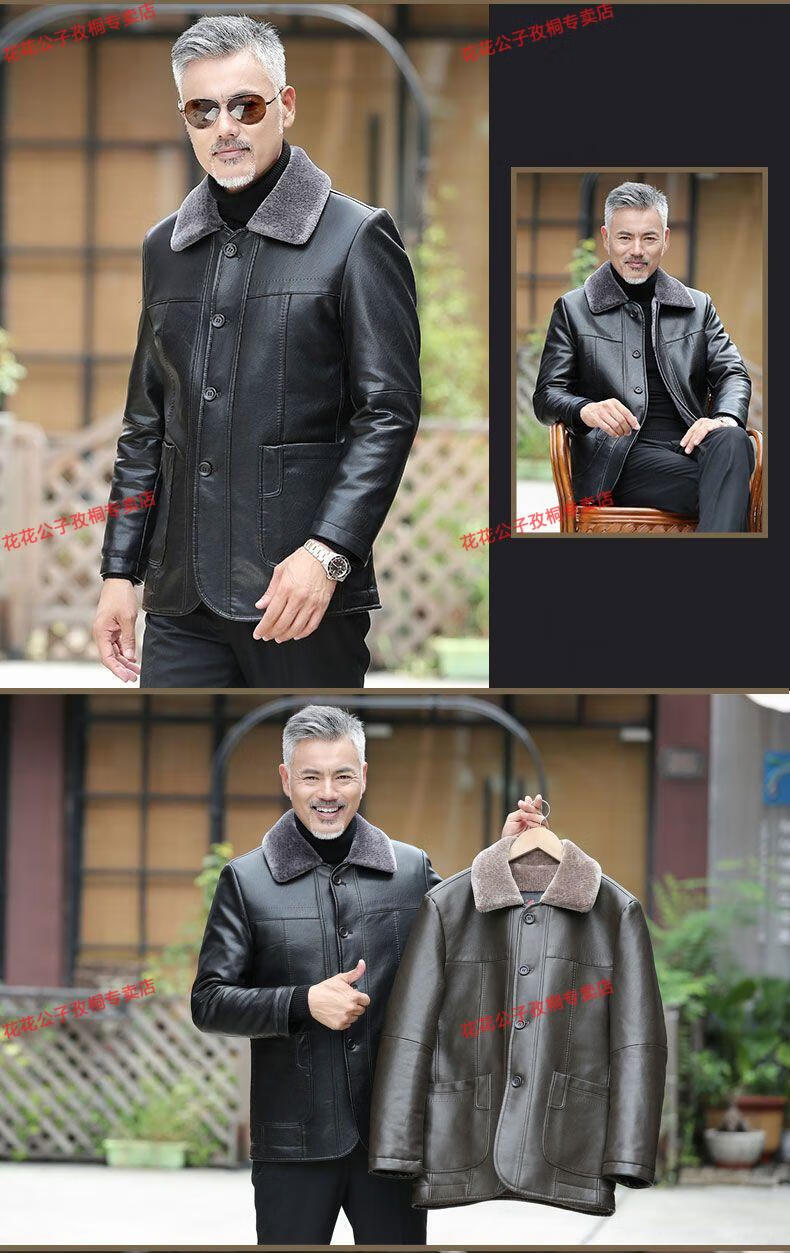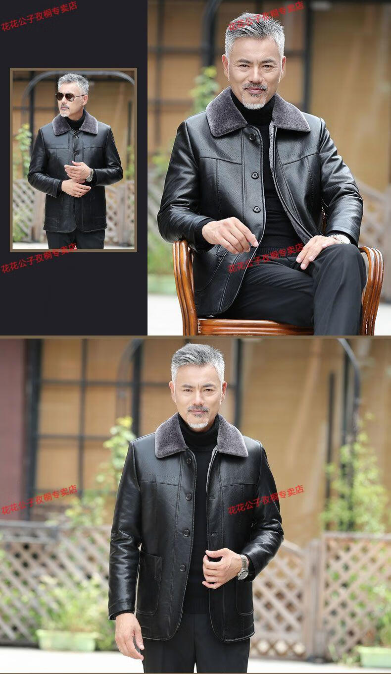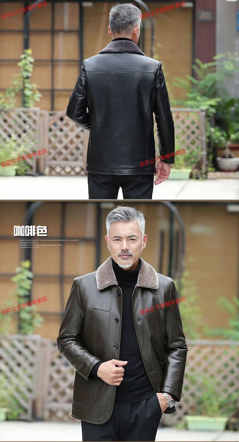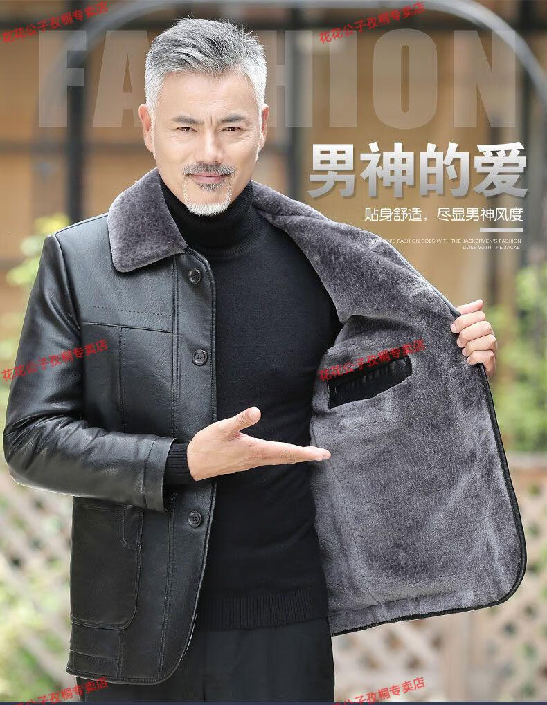 Playboy dad winter coat velvet thickened middle-aged 50-60 leather jacket 70 middle-aged and elderly men's fur all-in-one leather jacket black (button style) 4XL 195 suitable for 160-180 Jin Jin equals 0.5 kg