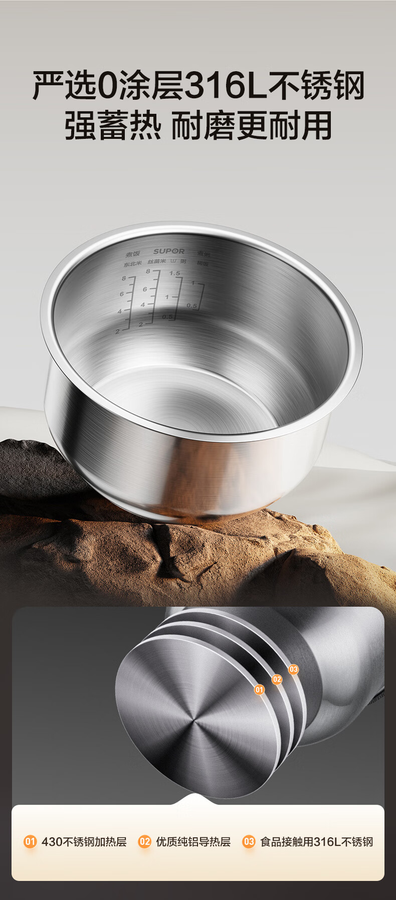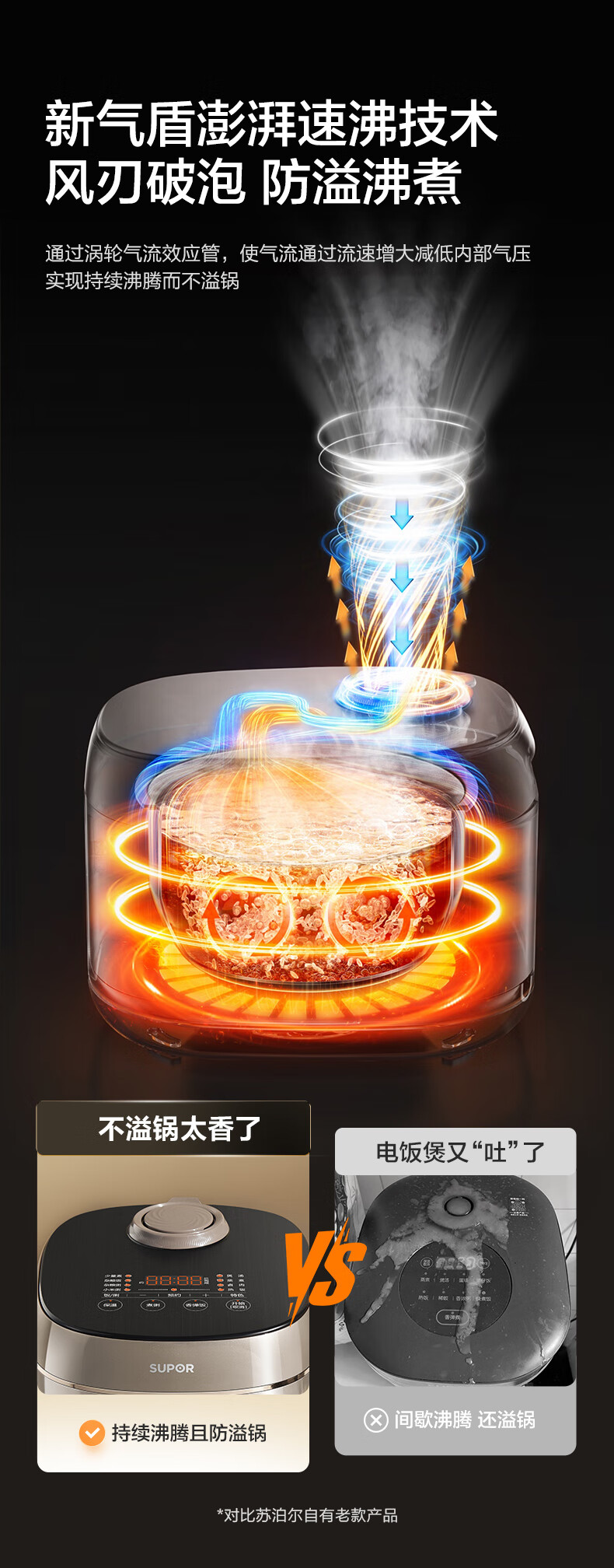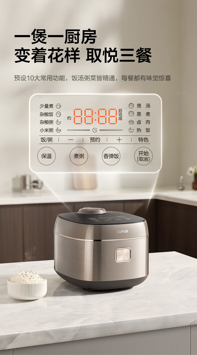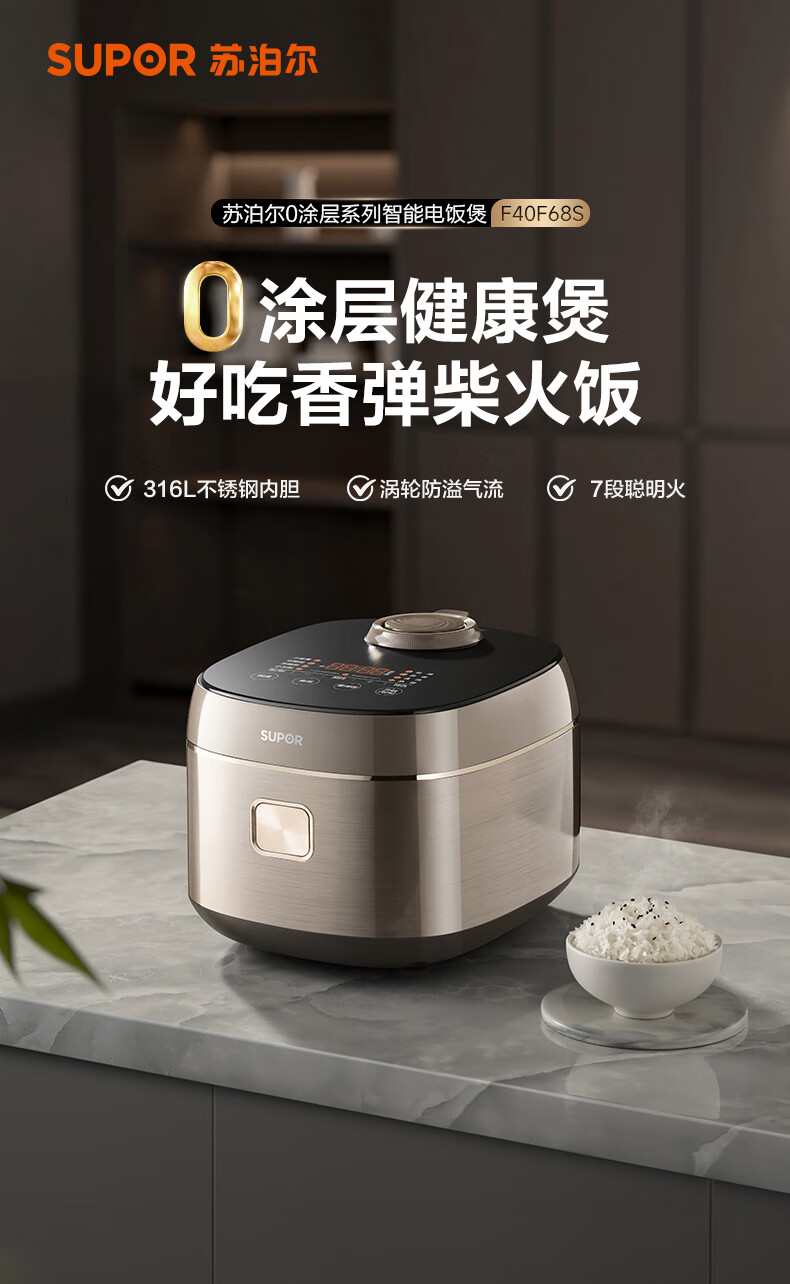 苏泊尔(SUPOR)电饭煲电饭锅 0涂层不锈钢二级能效煮饭锅 家用4L3-6人智能预约电饭煲 煮饭煮粥防溢锅F40F68S 【0涂层】创新气盾速沸防溢技术 4L 0涂层涡轮防溢