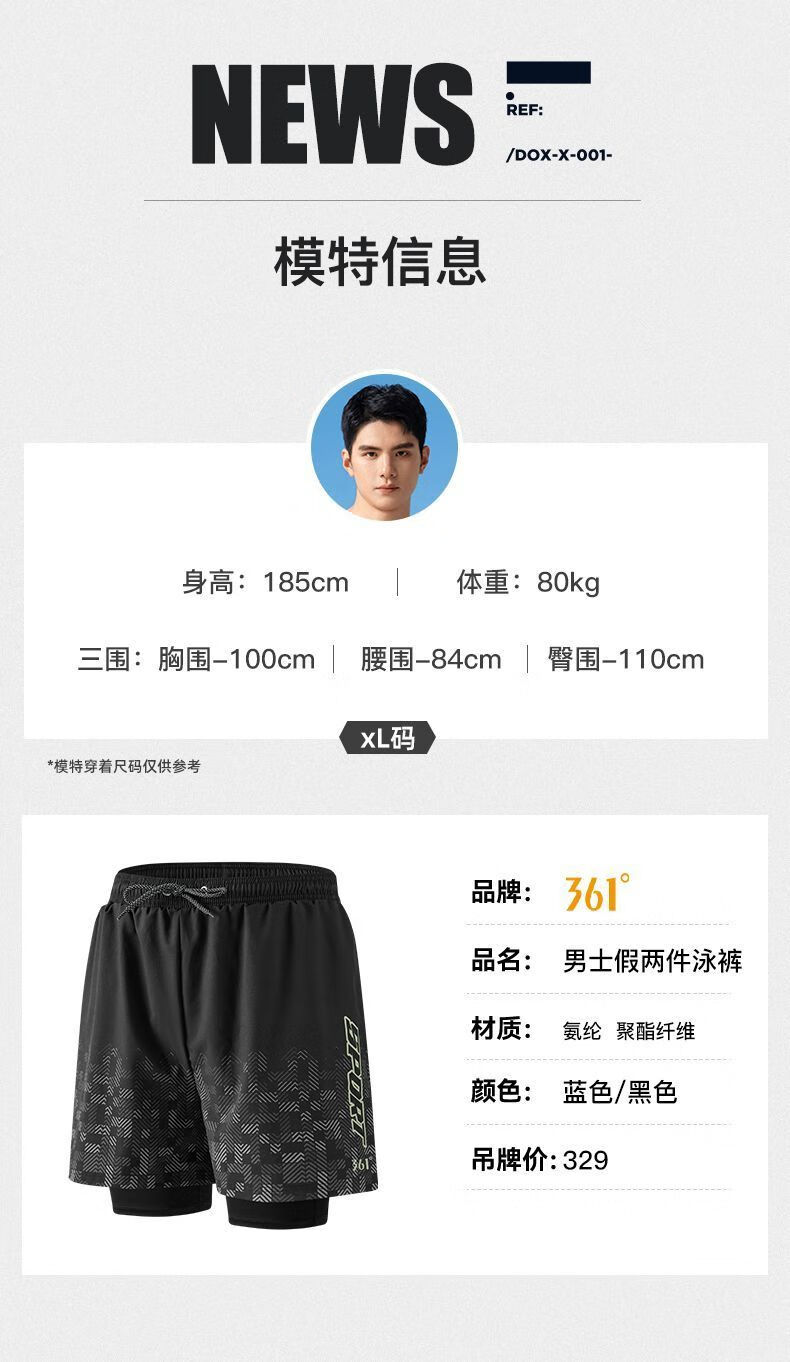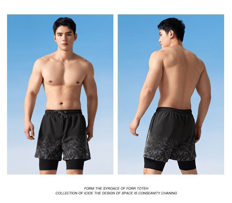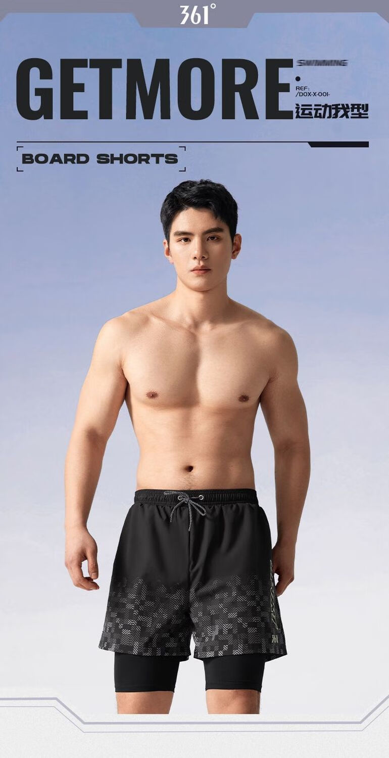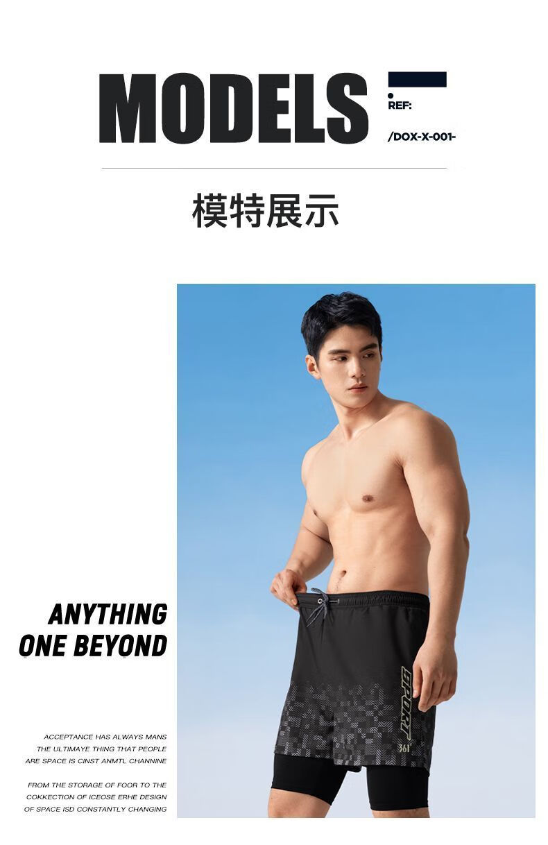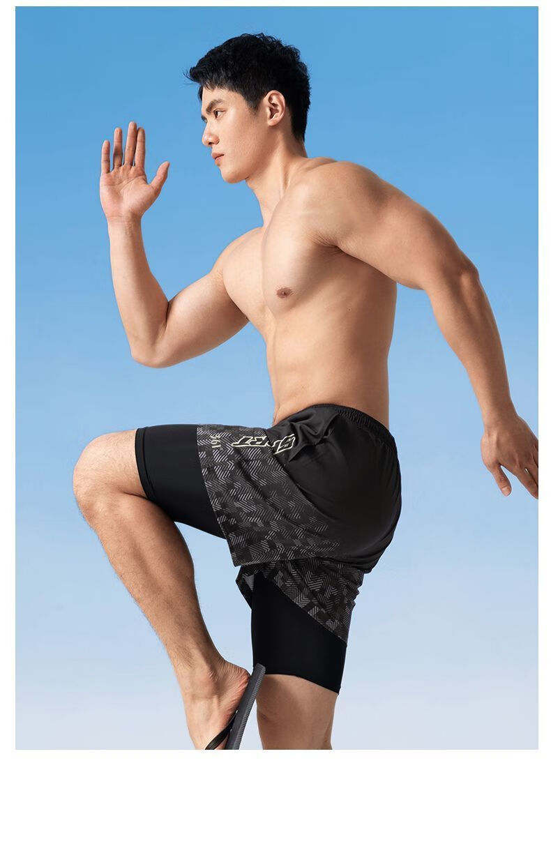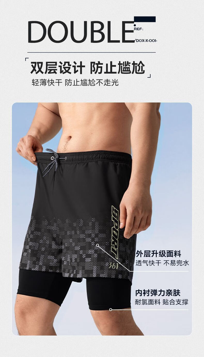 361 Men's new style anti-embarrassing large size five-point swimming trunks adult double-layer swimming sports quick-drying shorts black swimming trunks+swimming cap+swimming goggles+mobile phone waterproof bag M