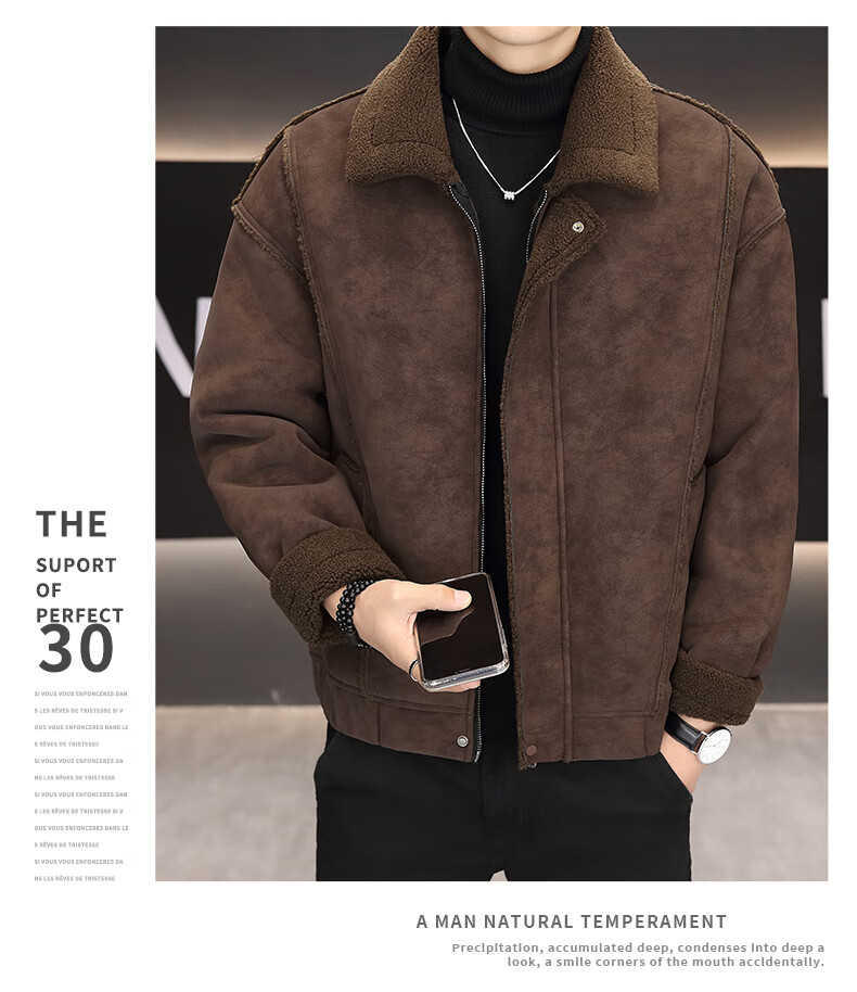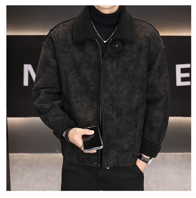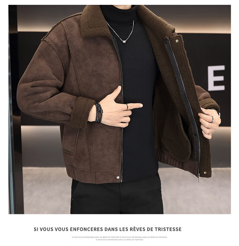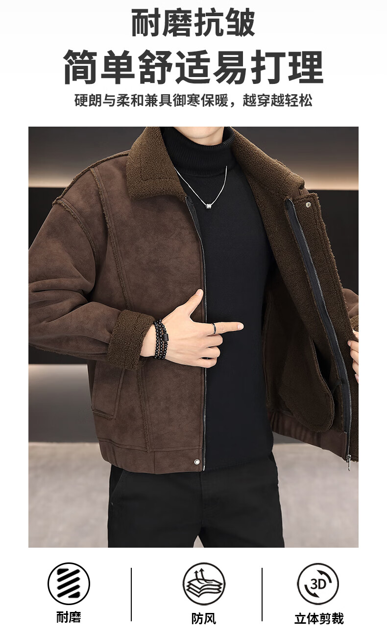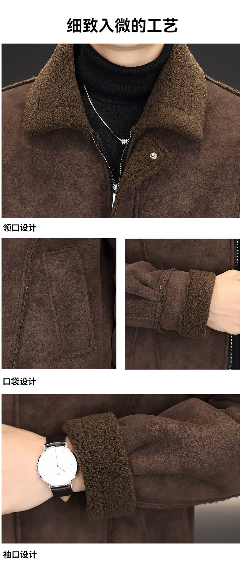 恒源祥皮毛一体男士皮衣冬季加绒加厚鹿皮绒PU皮翻领夹克保暖棉袄外套潮 咖啡色 L