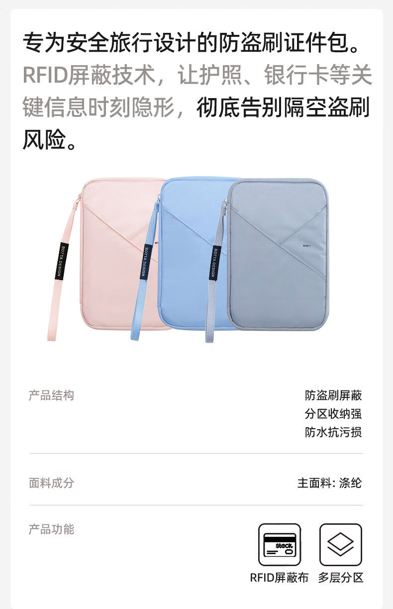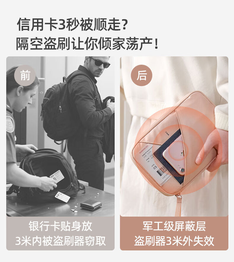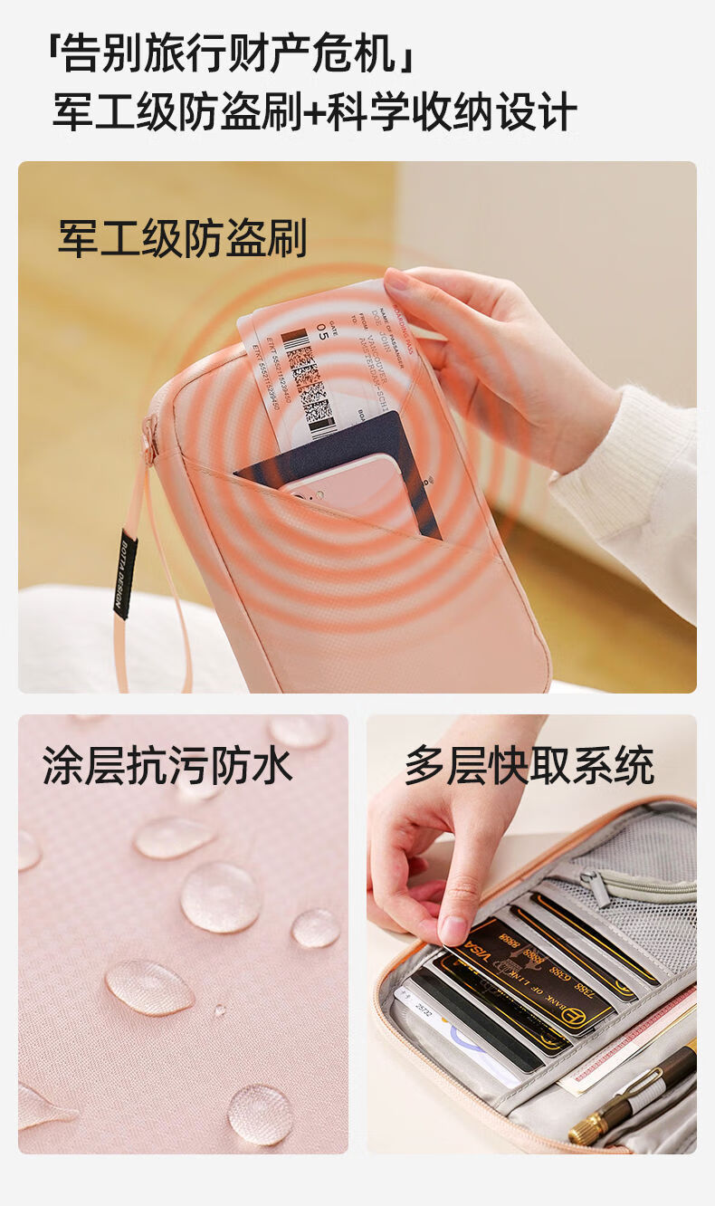 素良生活日本RFID防盗刷证件收纳包登机牌护照保护套出国旅行卡包护照夹 粉色M号含挂颈带