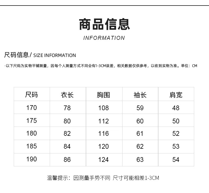 China (cm) 165 / 88-90 170 / 96-98 175 / 108-110 180 / 118-122 185 / 126-130
