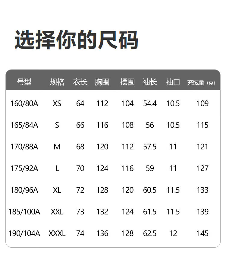 China (cm) 165 / 88-90 170 / 96-98 175 / 108-110 180 / 118-122 185 / 126-130