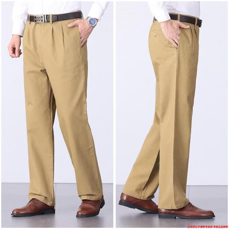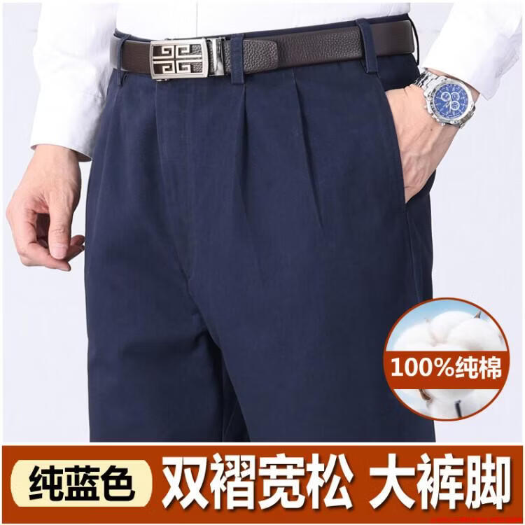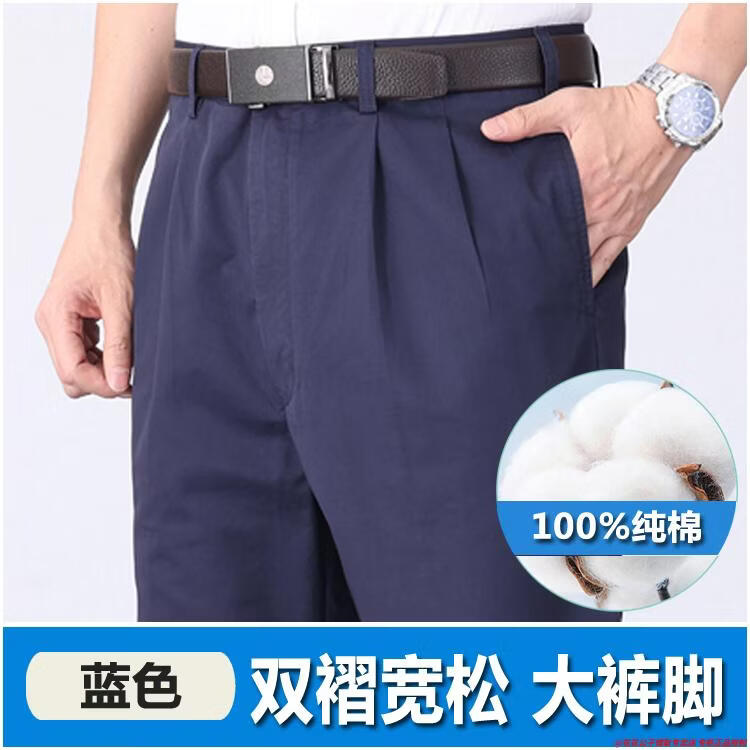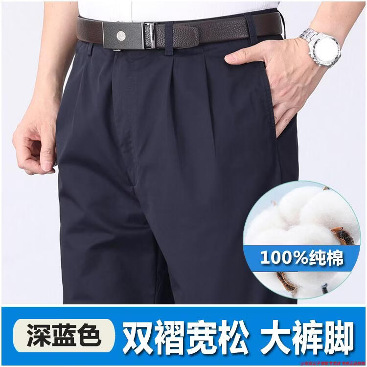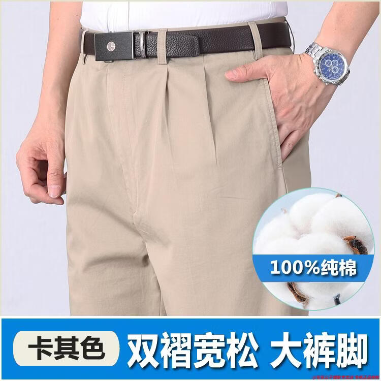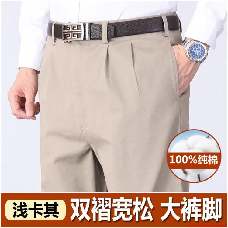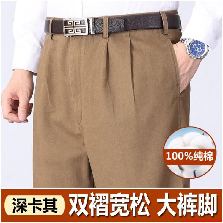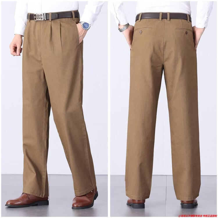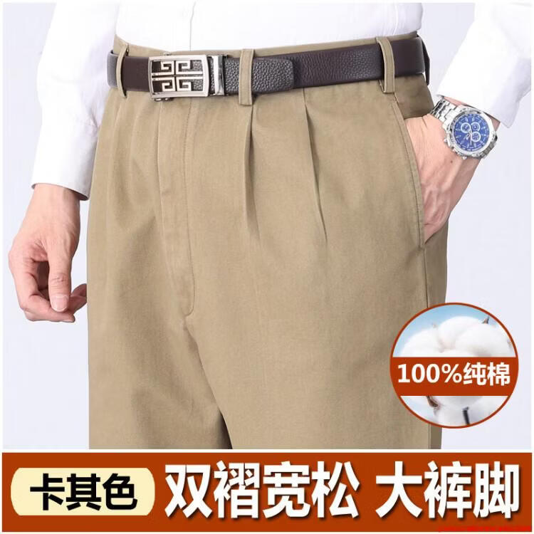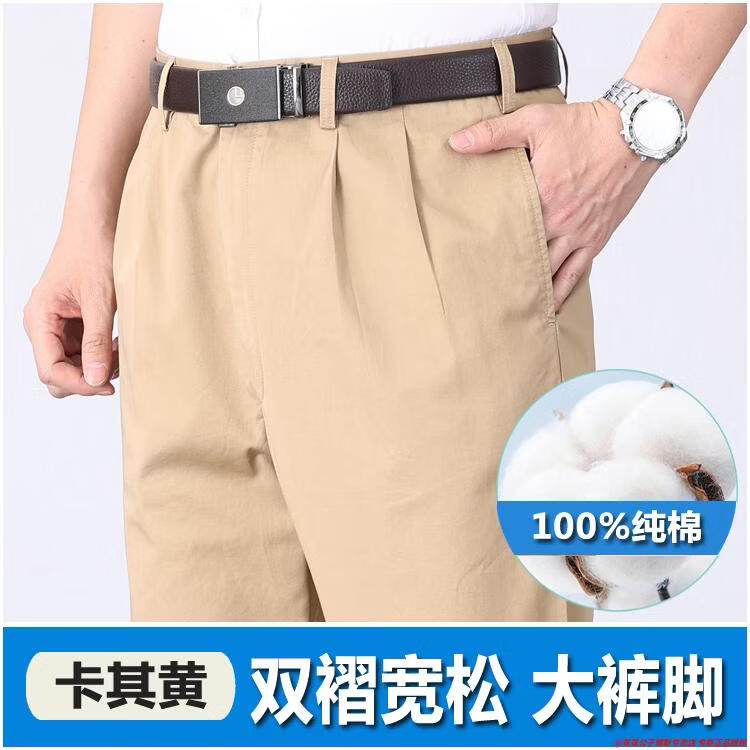 Playboy middle-aged and elderly pure cotton casual pants men's autumn and winter thick no-iron high-waisted men's pants double pleated deep crotch large size long pants thick/light khaki double pleated large trouser legs 100% cotton / 46 3 feet 4 waist 46