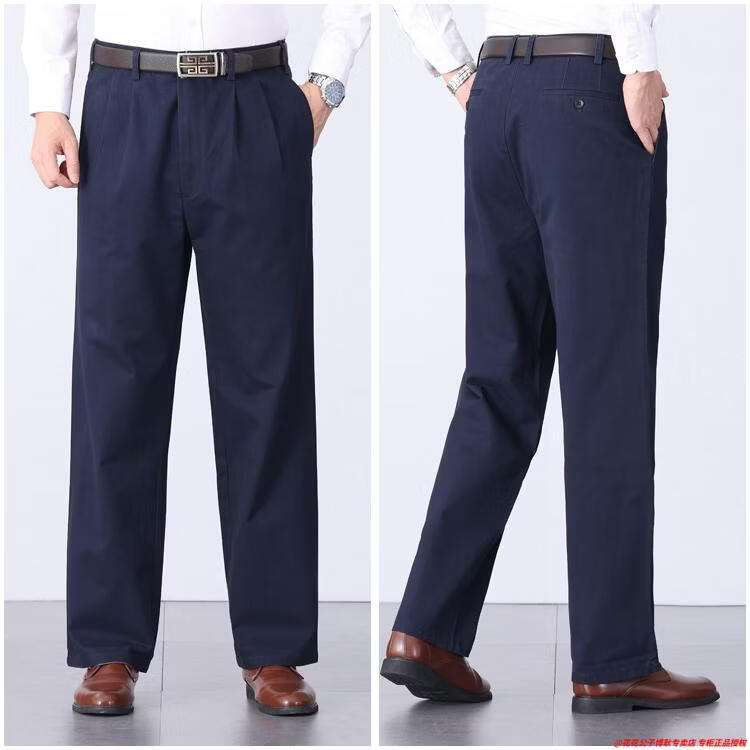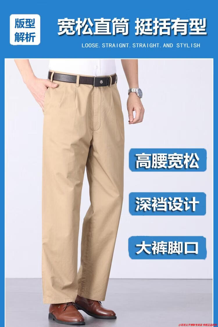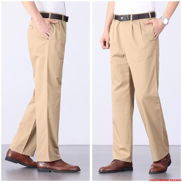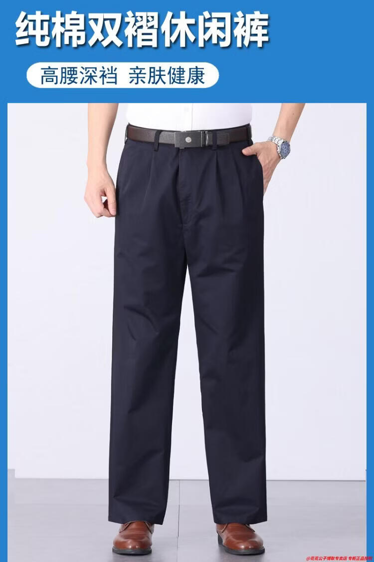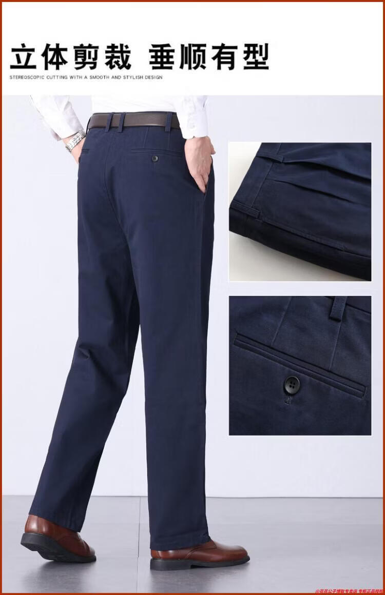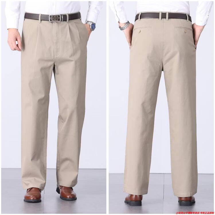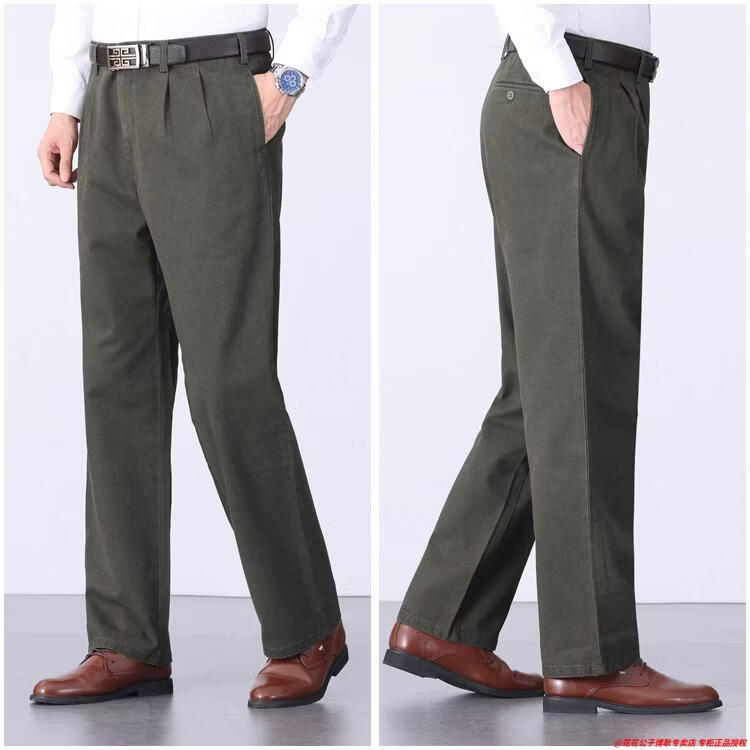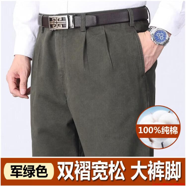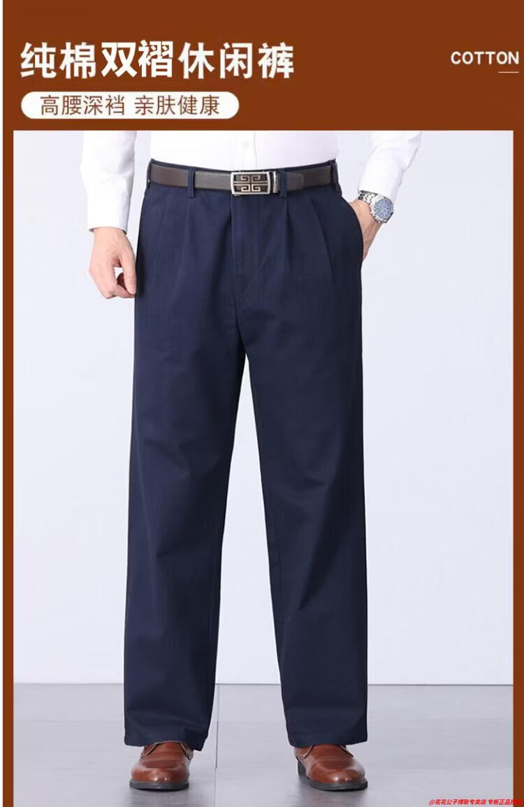 Playboy middle-aged and elderly pure cotton casual pants men's autumn and winter thick no-iron high-waisted men's pants double pleated deep crotch large size long pants thick/light khaki double pleated large trouser legs 100% cotton / 46 3 feet 4 waist 46