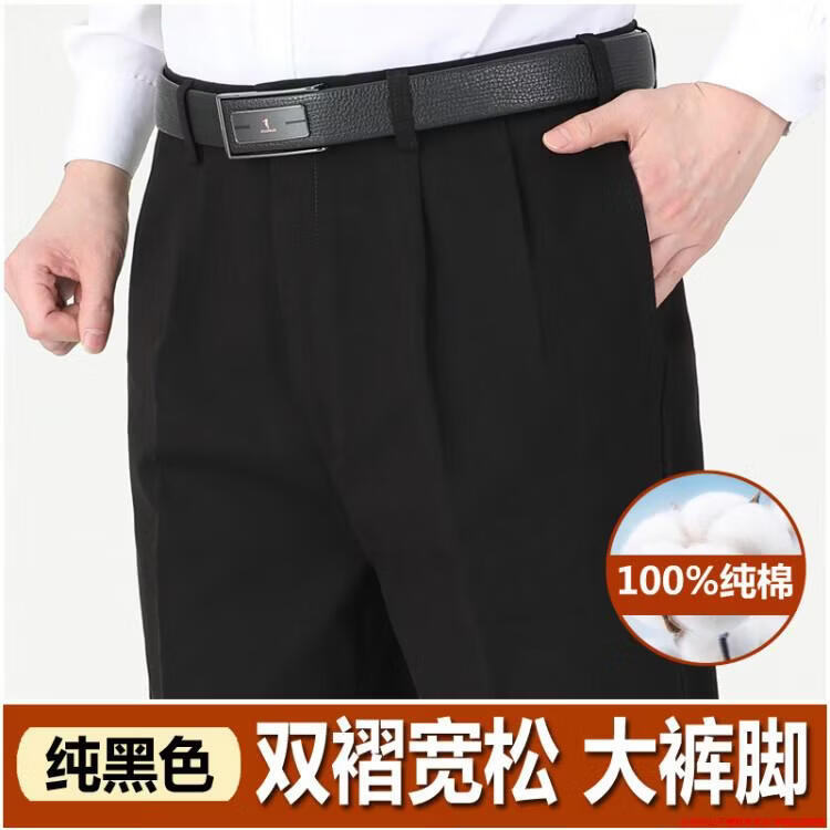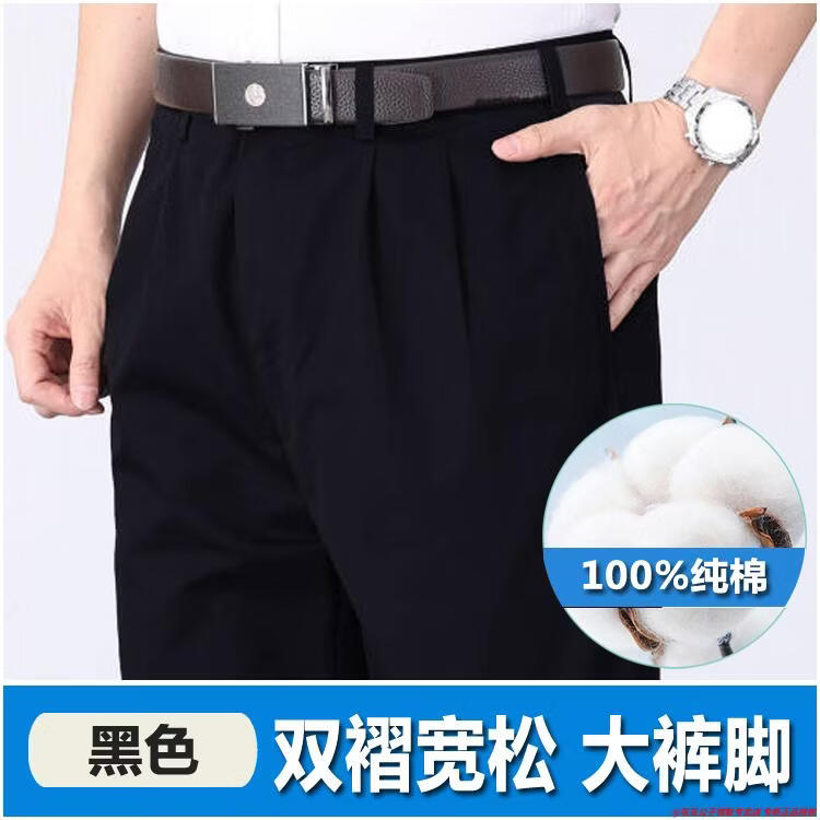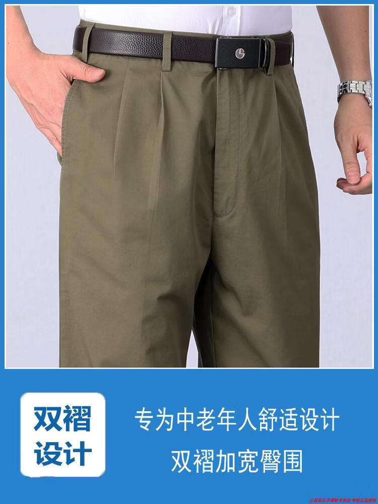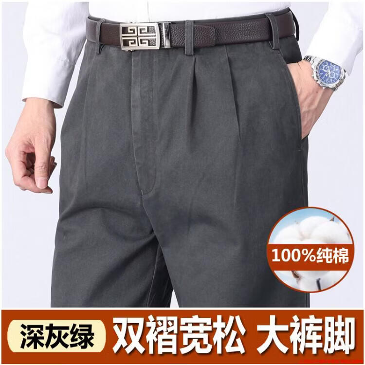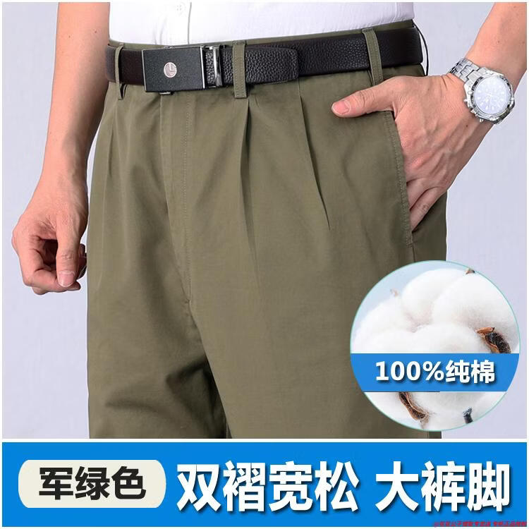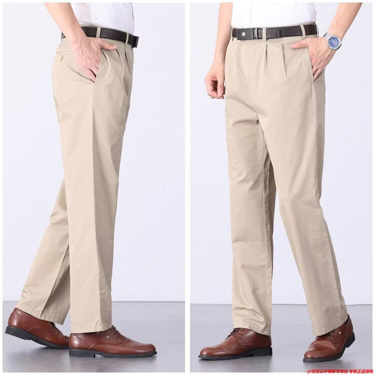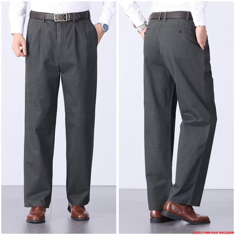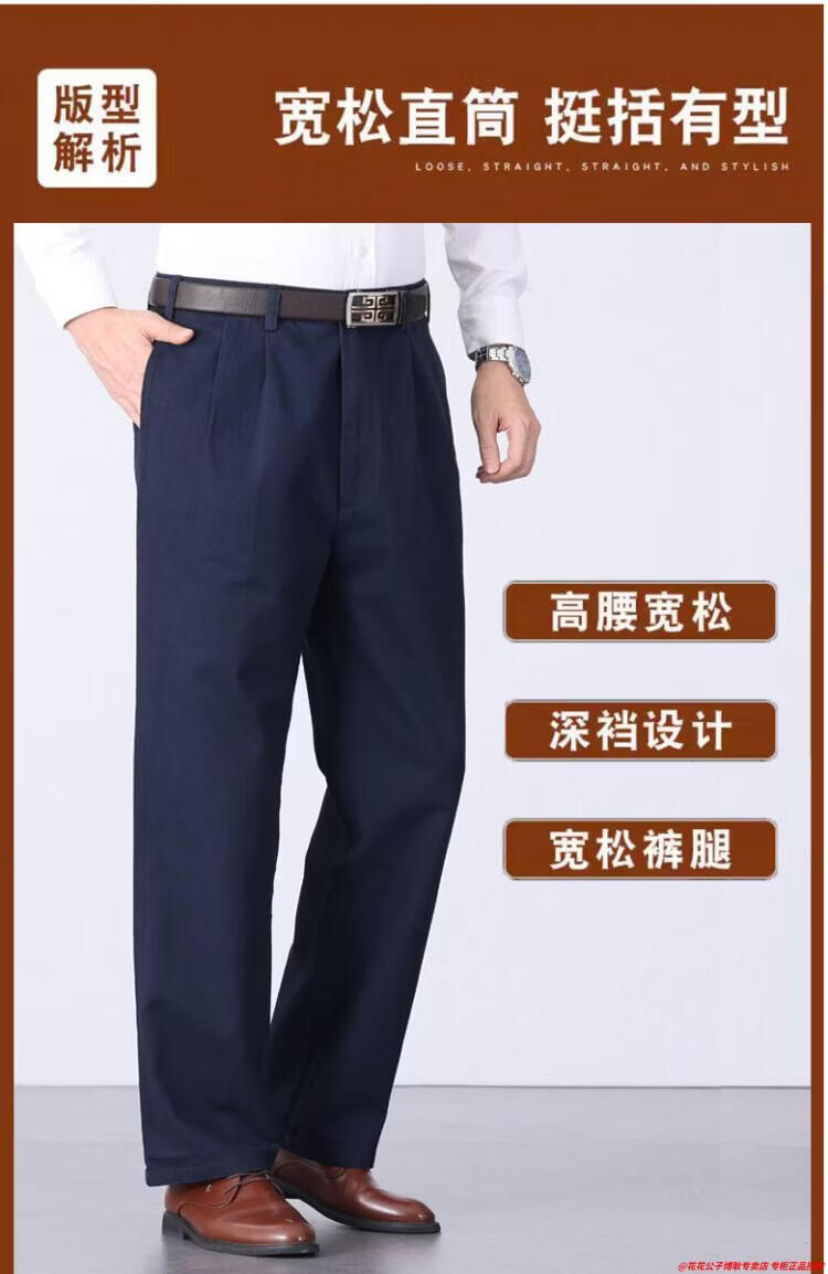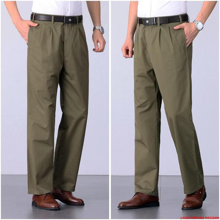 Playboy middle-aged and elderly pure cotton casual pants men's autumn and winter thick no-iron high-waisted men's pants double pleated deep crotch large size long pants thick/light khaki double pleated large trouser legs 100% cotton / 46 3 feet 4 waist 46