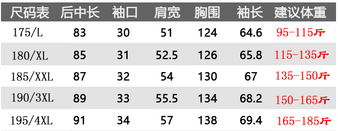 China (cm) 165 / 88-90 170 / 96-98 175 / 108-110 180 / 118-122 185 / 126-130