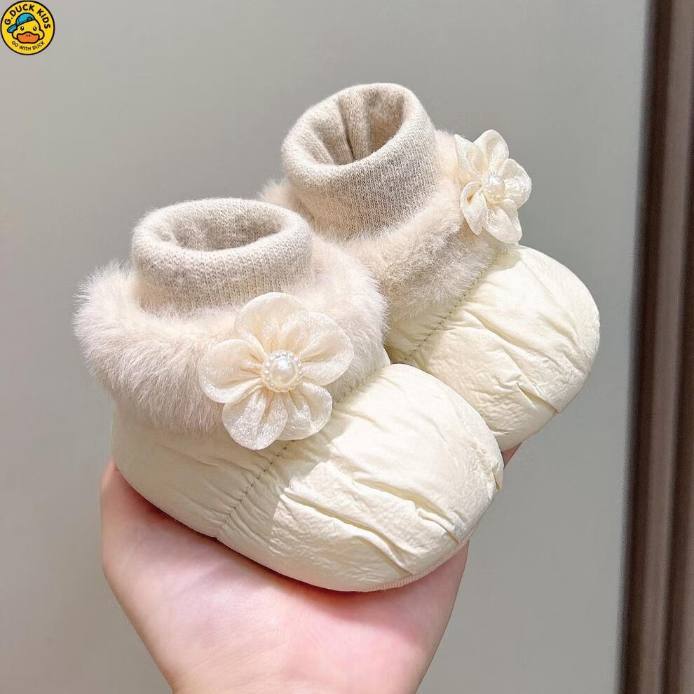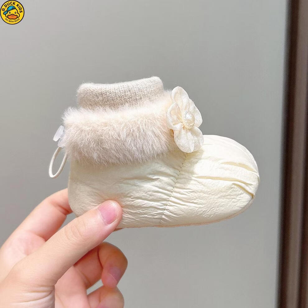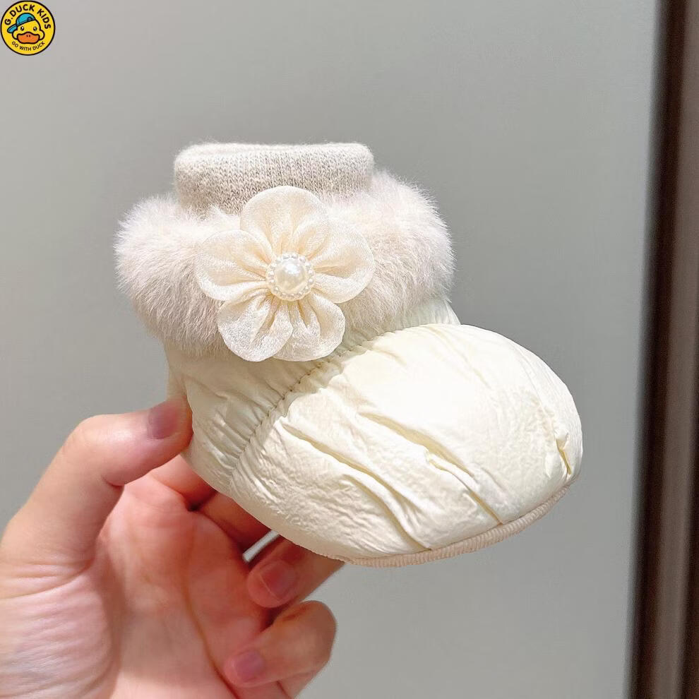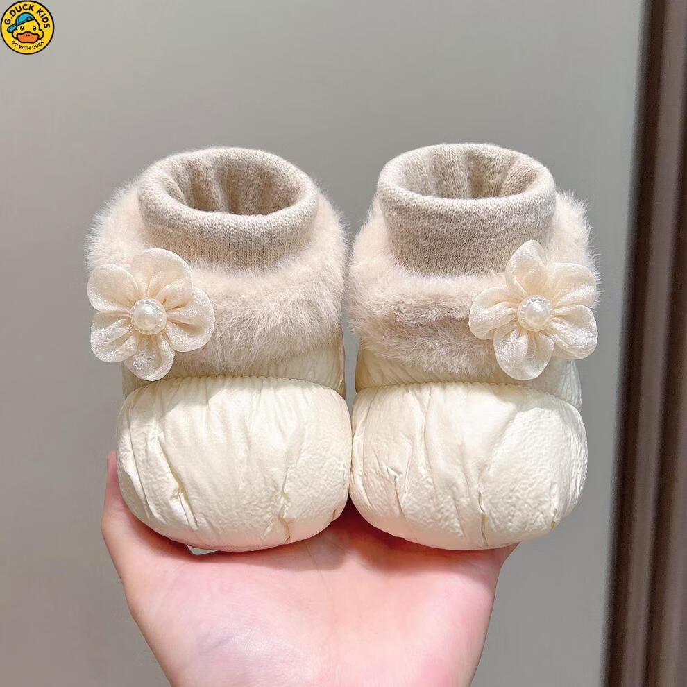 G.duck小黄鸭冬季婴儿加绒软底鞋女宝宝棉鞋袜保暖新生儿鞋子0-1岁花朵 卡其(冬暖棉鞋-侧上琉金花) 11.5 内长cm
