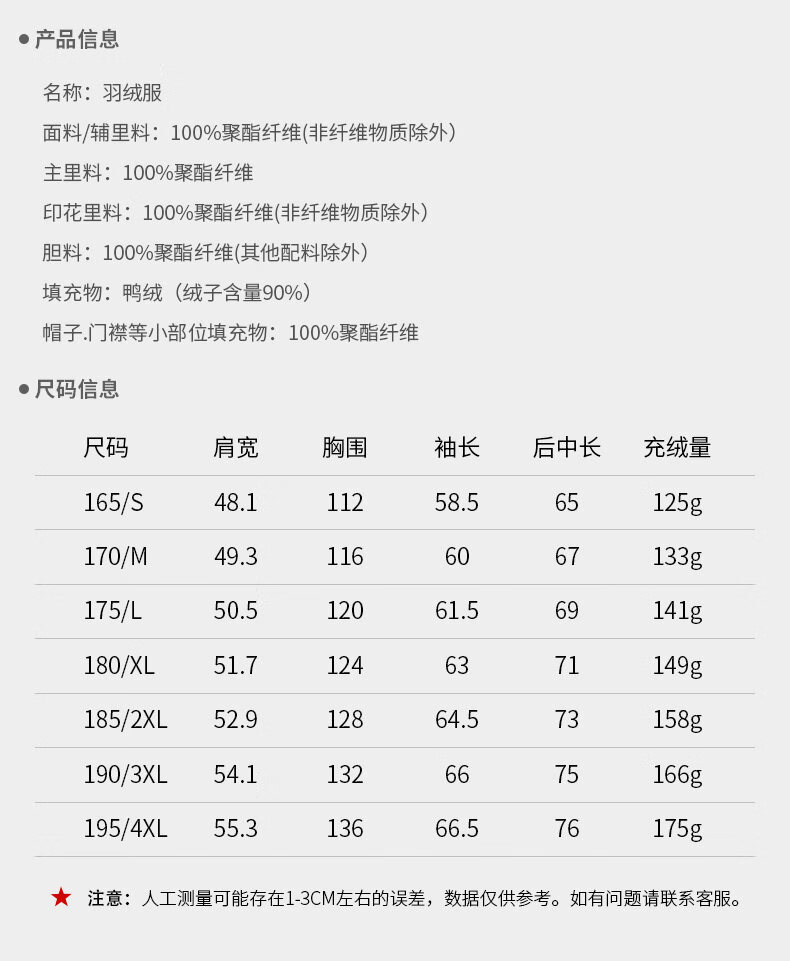 China (cm) 165 / 88-90 170 / 96-98 175 / 108-110 180 / 118-122 185 / 126-130