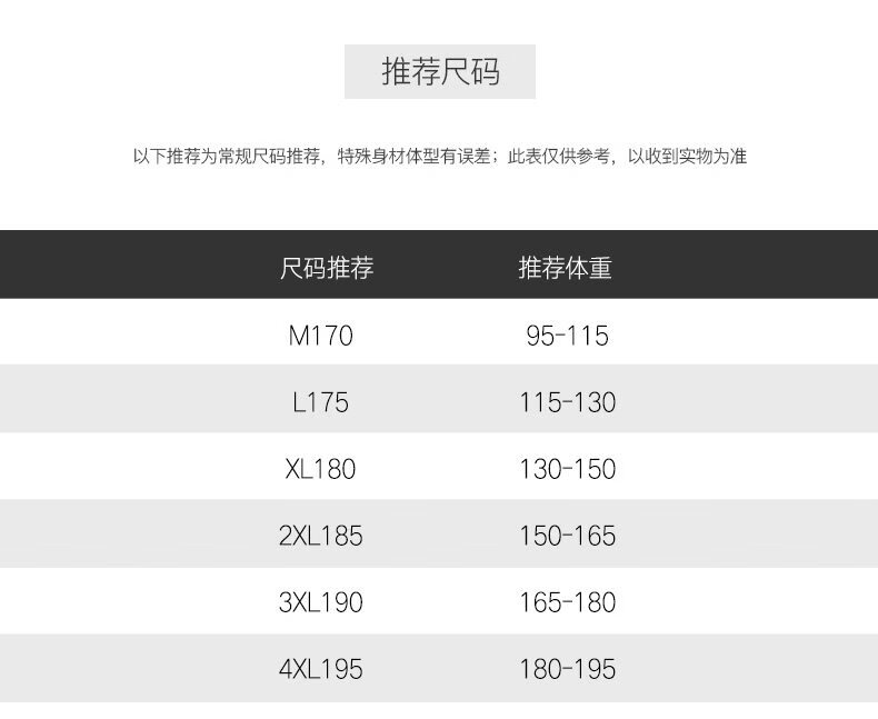 China (cm) 165 / 88-90 170 / 96-98 175 / 108-110 180 / 118-122 185 / 126-130