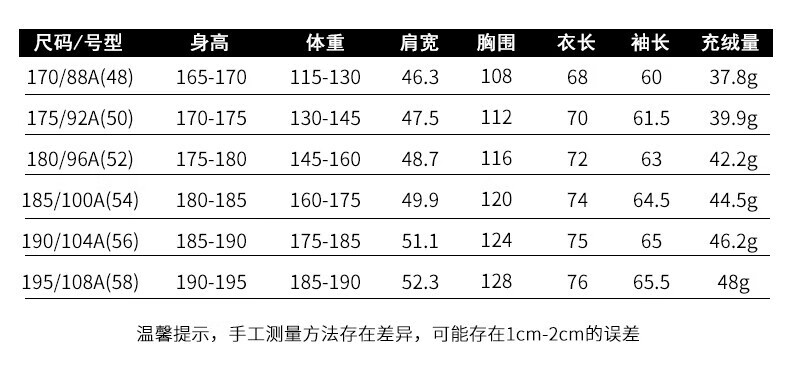 China (cm) 165 / 88-90 170 / 96-98 175 / 108-110 180 / 118-122 185 / 126-130