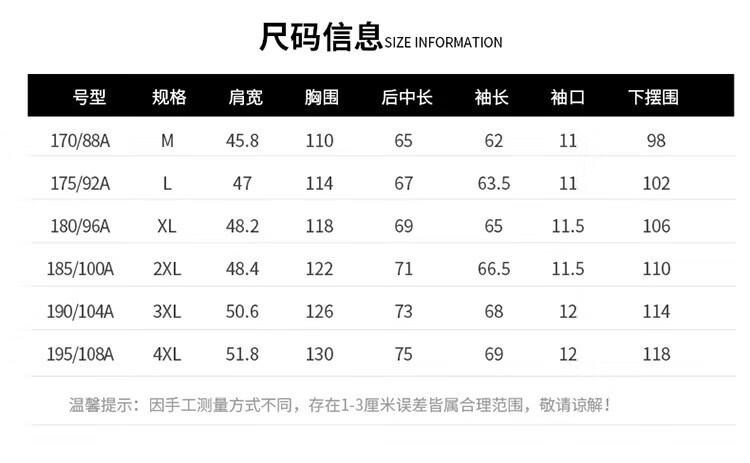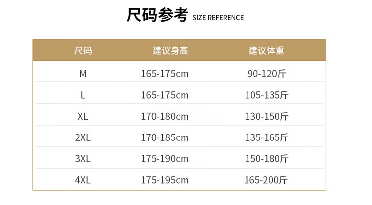 China (cm) 165 / 88-90 170 / 96-98 175 / 108-110 180 / 118-122 185 / 126-130
