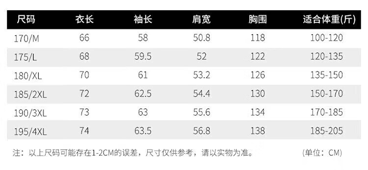 China (cm) 165 / 88-90 170 / 96-98 175 / 108-110 180 / 118-122 185 / 126-130