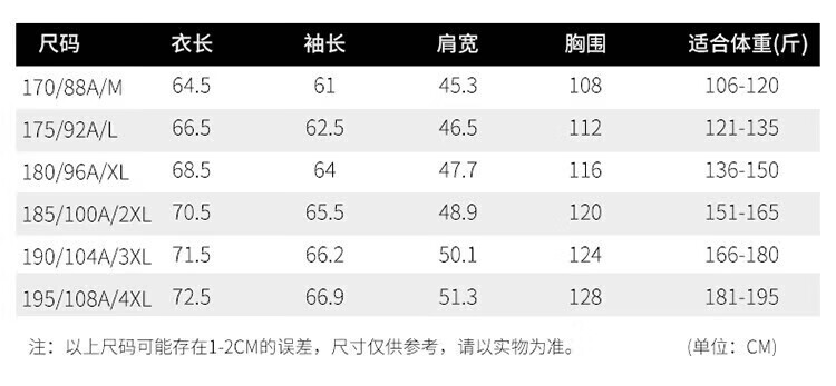 China (cm) 165 / 88-90 170 / 96-98 175 / 108-110 180 / 118-122 185 / 126-130