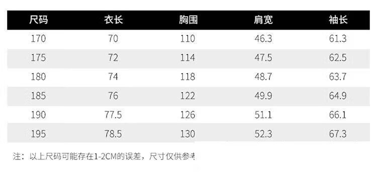 China (cm) 165 / 88-90 170 / 96-98 175 / 108-110 180 / 118-122 185 / 126-130
