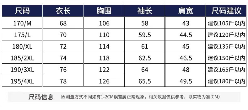 China (cm) 165 / 88-90 170 / 96-98 175 / 108-110 180 / 118-122 185 / 126-130