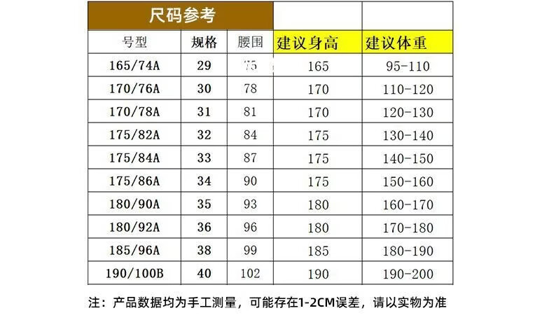 China (cm) 165 / 88-90 170 / 96-98 175 / 108-110 180 / 118-122 185 / 126-130