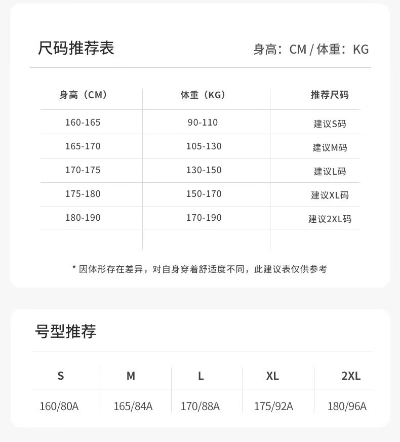China (cm) 165 / 88-90 170 / 96-98 175 / 108-110 180 / 118-122 185 / 126-130