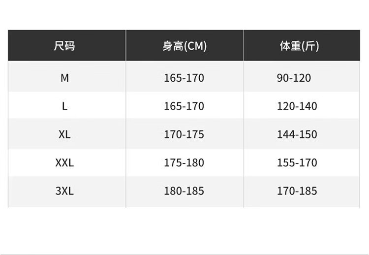 China (cm) 165 / 88-90 170 / 96-98 175 / 108-110 180 / 118-122 185 / 126-130
