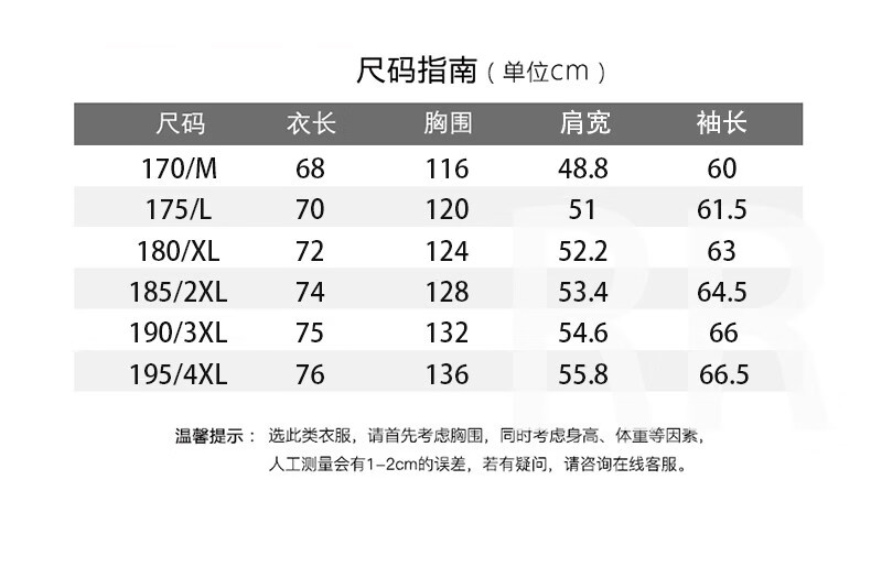 China (cm) 165 / 88-90 170 / 96-98 175 / 108-110 180 / 118-122 185 / 126-130