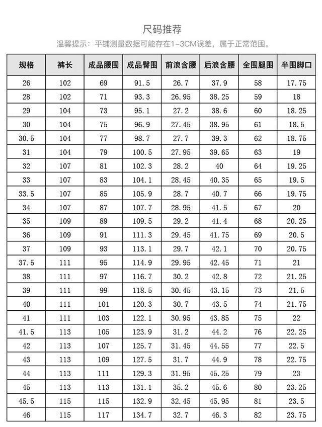 Outseam (cm) 99 cm 101.5 cm 104 cm 106.5 cm 109 cm