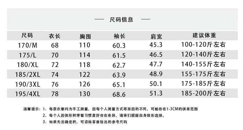 China (cm) 165 / 88-90 170 / 96-98 175 / 108-110 180 / 118-122 185 / 126-130