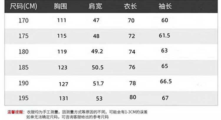 China (cm) 165 / 88-90 170 / 96-98 175 / 108-110 180 / 118-122 185 / 126-130