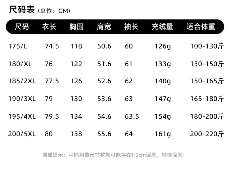 China (cm) 165 / 88-90 170 / 96-98 175 / 108-110 180 / 118-122 185 / 126-130