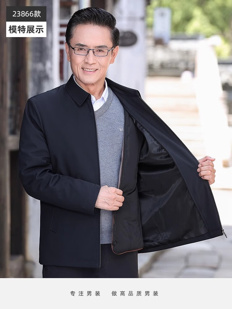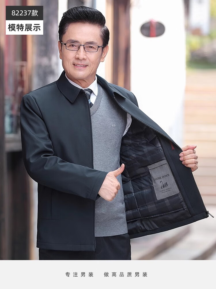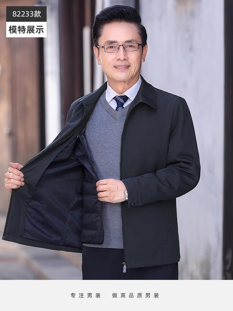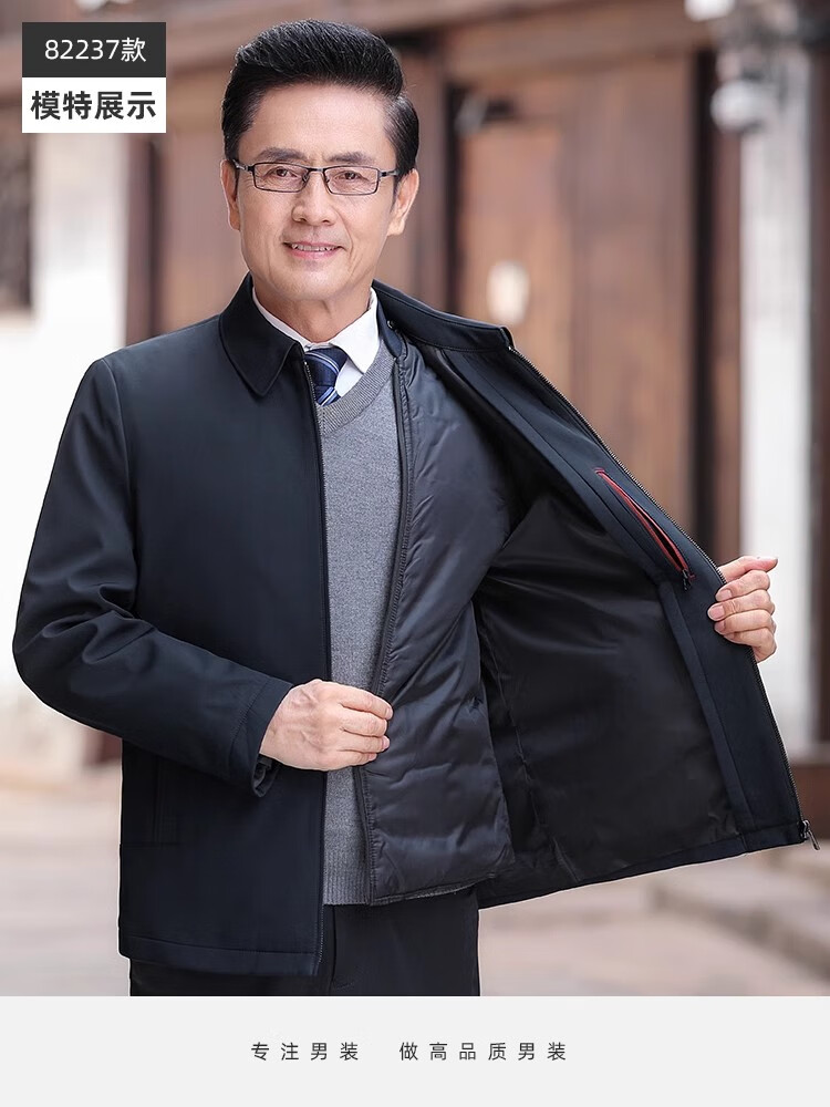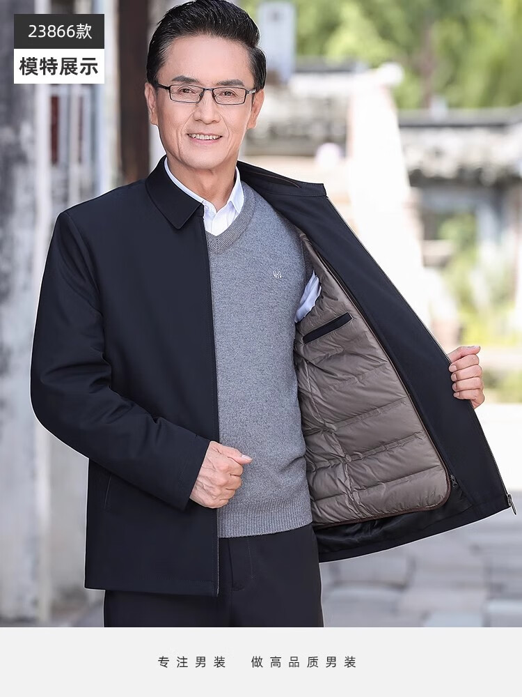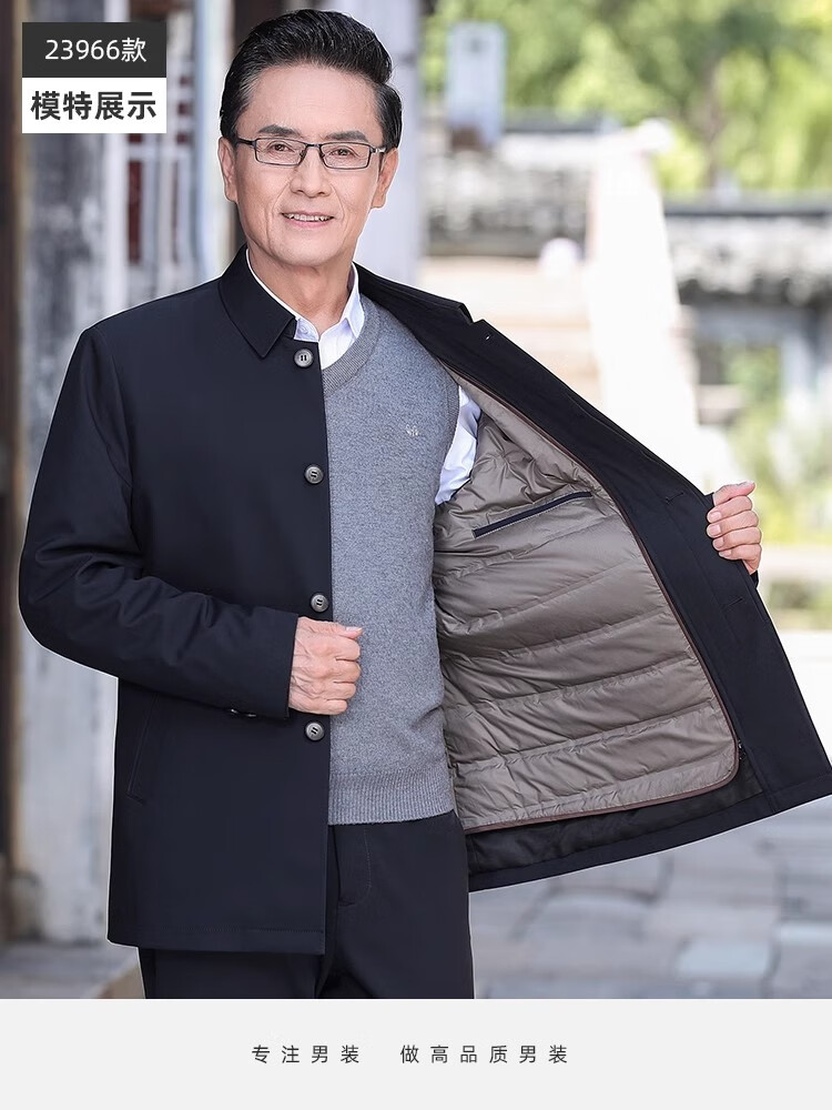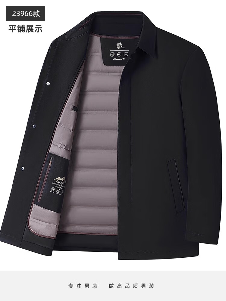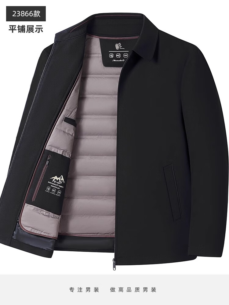 罗蒙(ROMON)中老年爸爸冬装轻薄翻领羽绒衣男士中年秋冬季加厚鹅绒外套 LYC-23866黑色【可拆内胆】 拉炼 炼 款 M 170/ 【90-120斤】