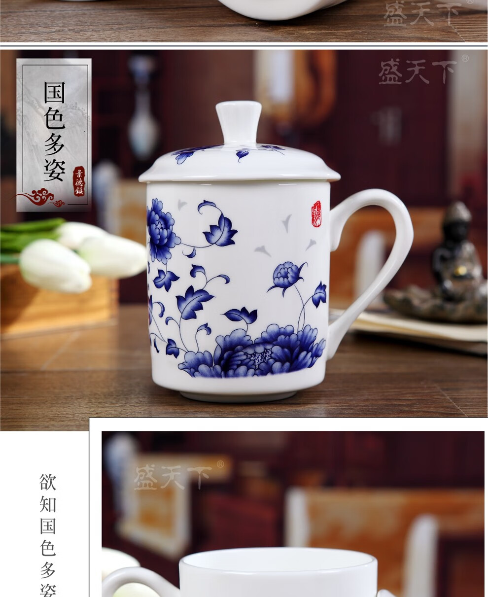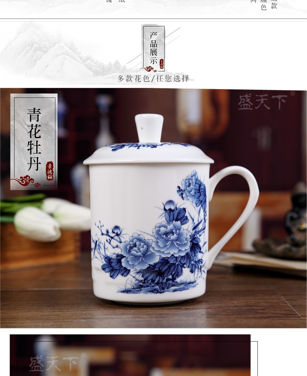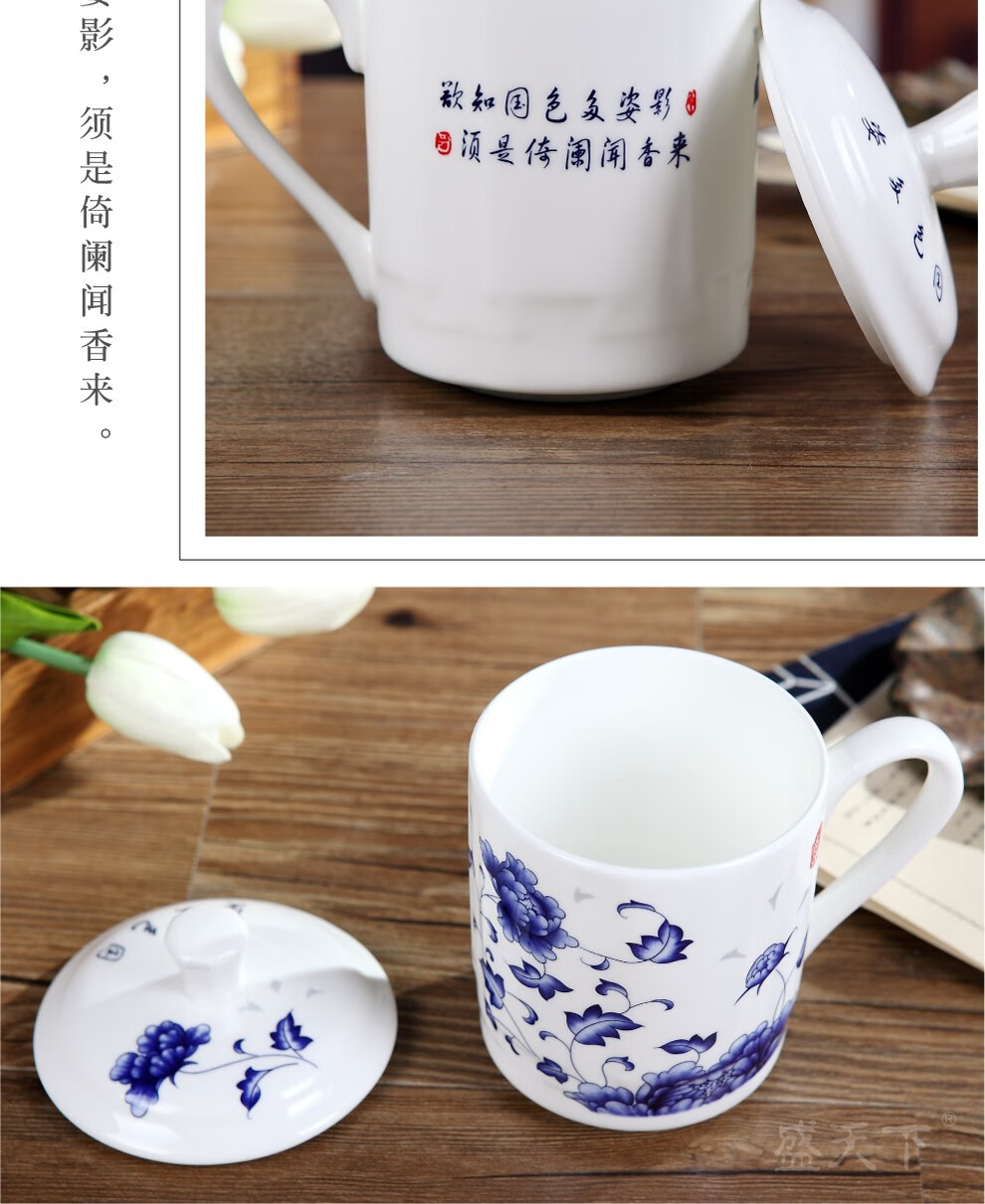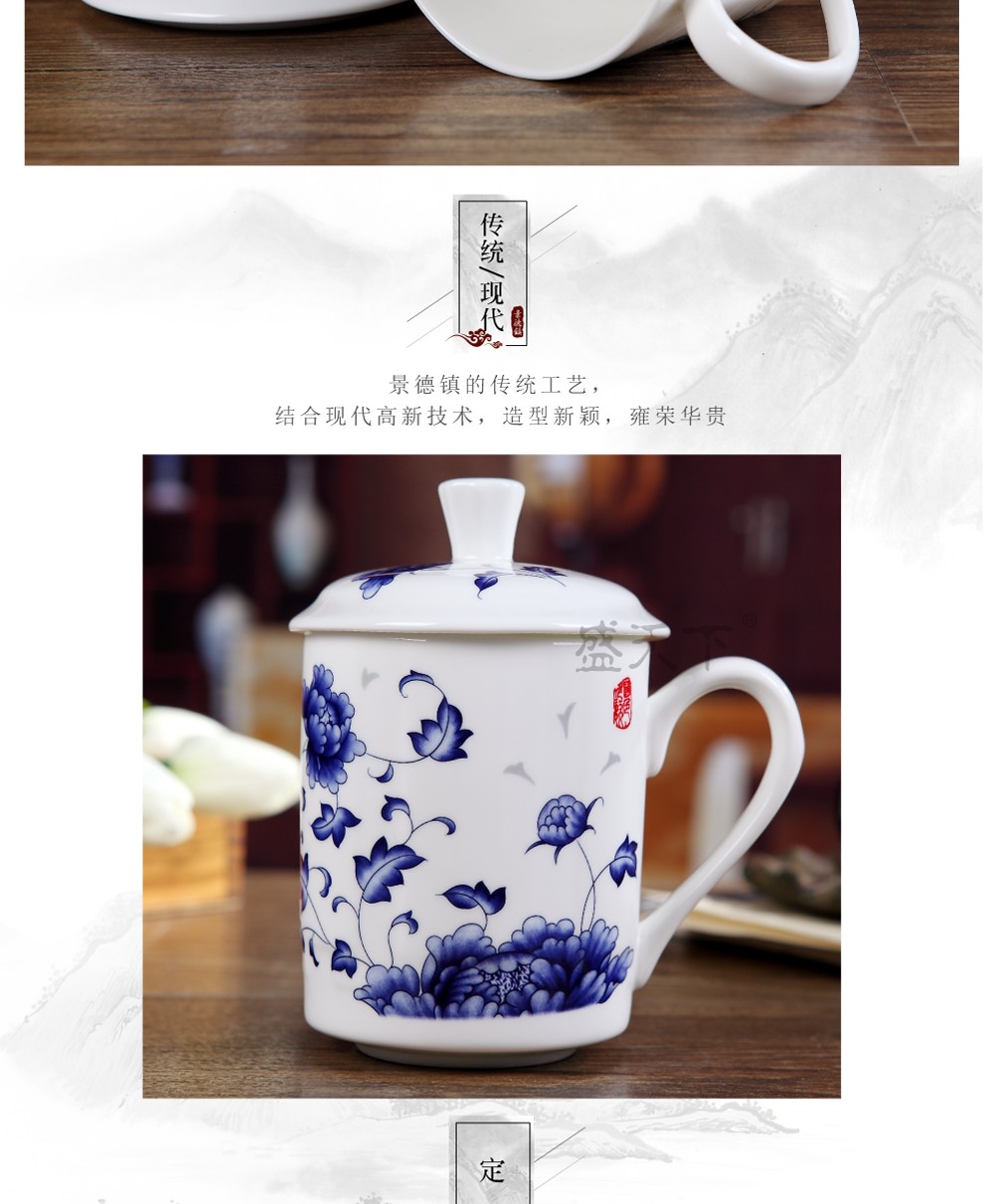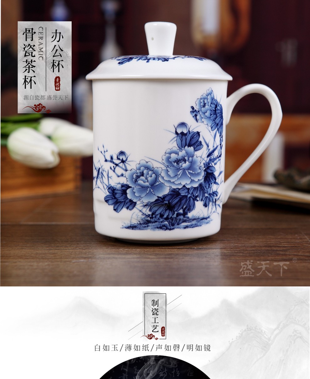 盛天下景德镇陶瓷茶杯带盖骨瓷杯青花水杯办公杯礼品杯会议杯子定制 青花牡丹 500ML