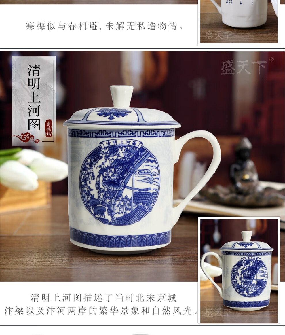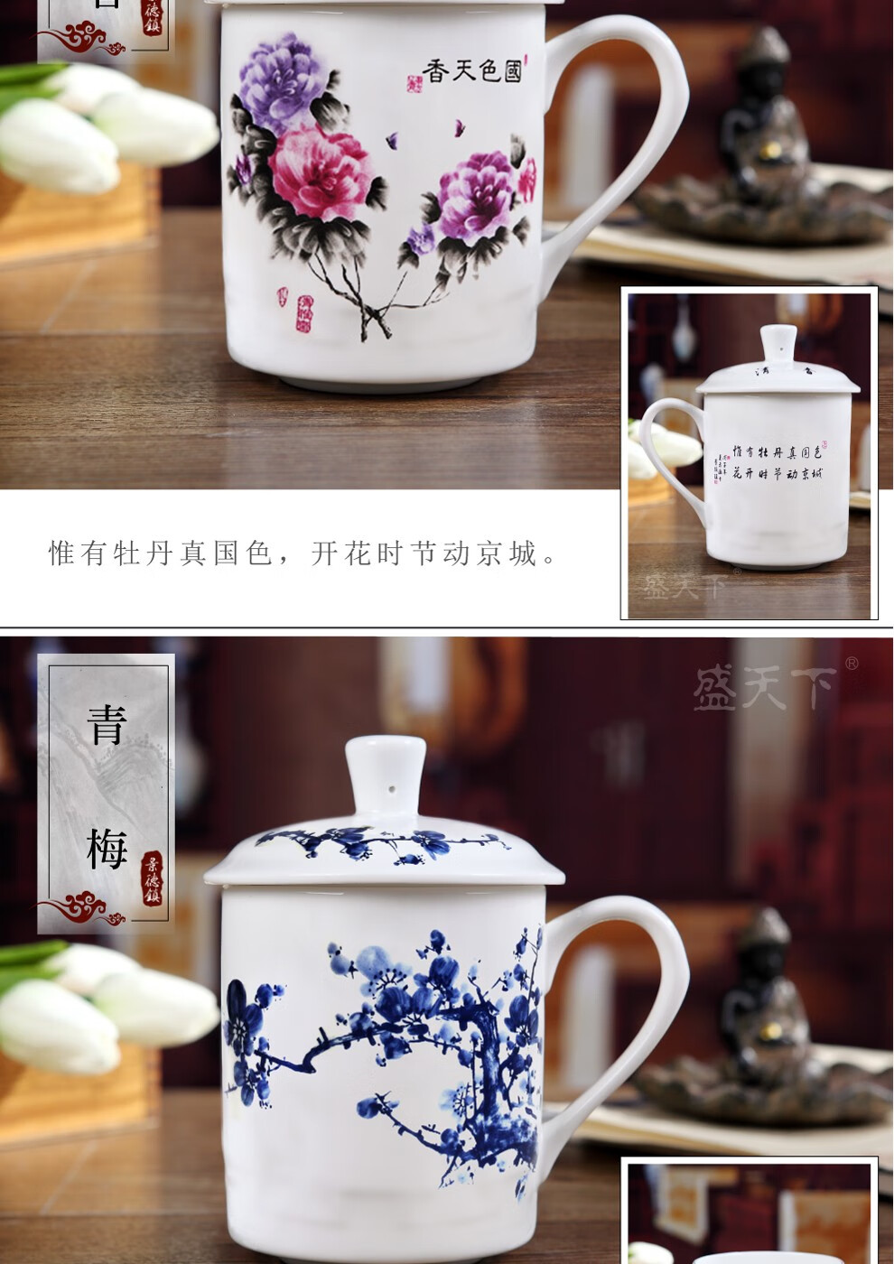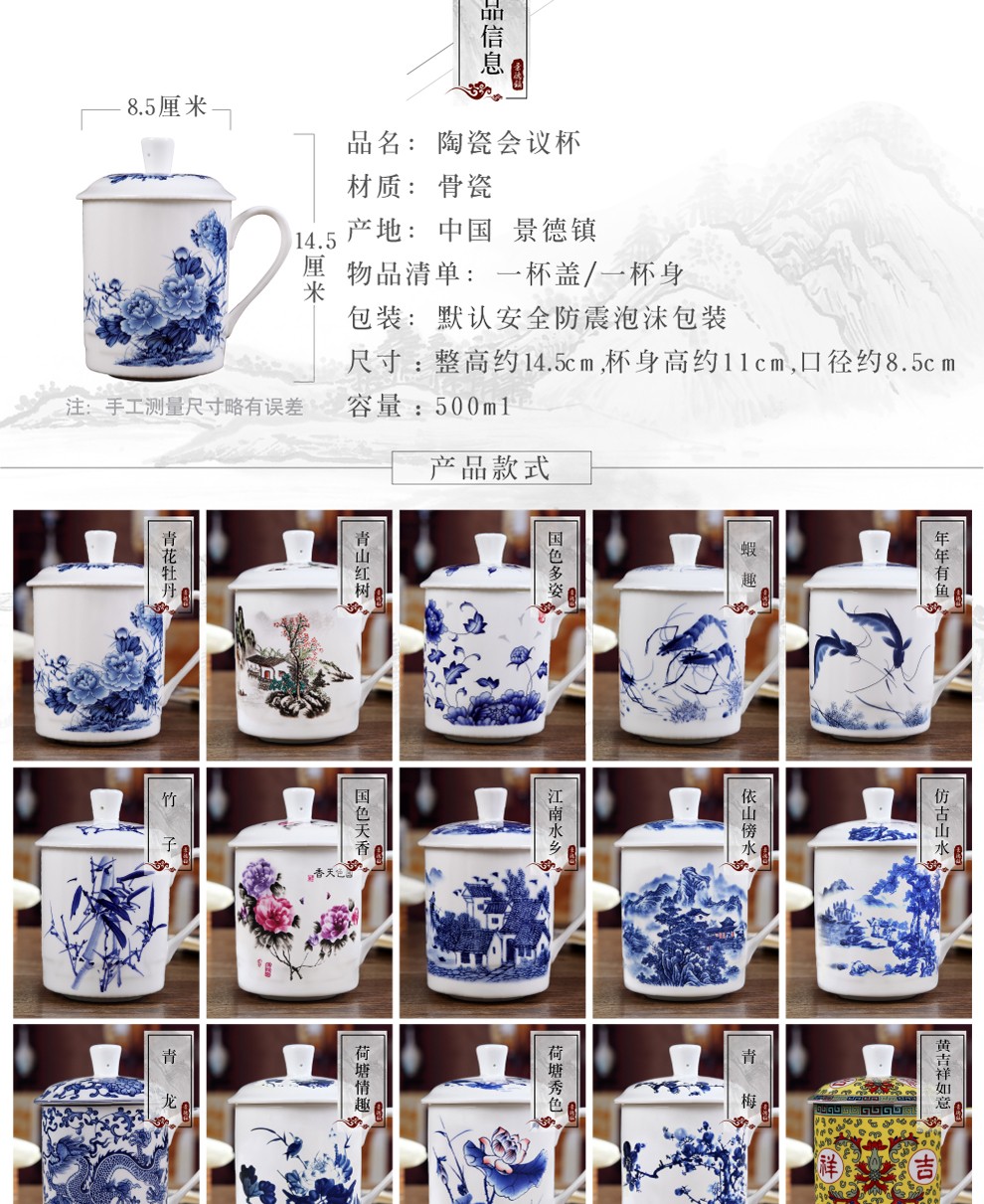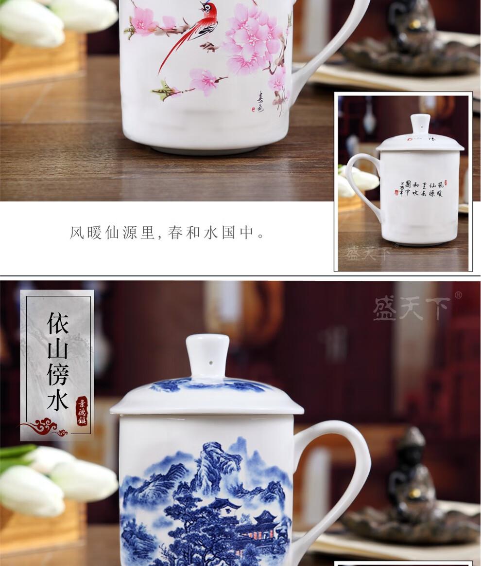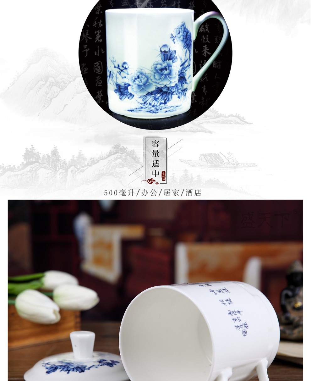 盛天下景德镇陶瓷茶杯带盖骨瓷杯青花水杯办公杯礼品杯会议杯子定制 青花牡丹 500ML