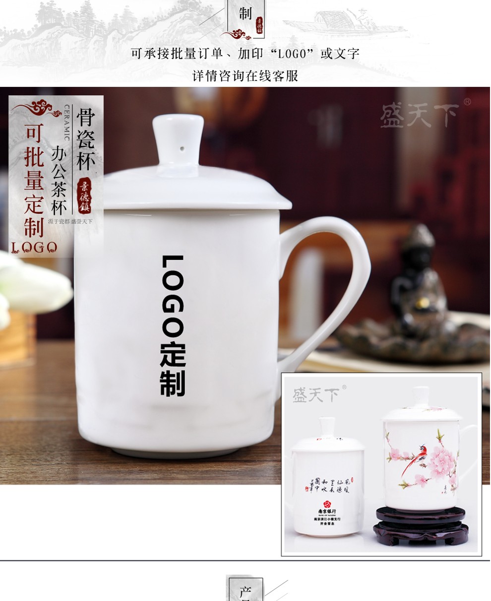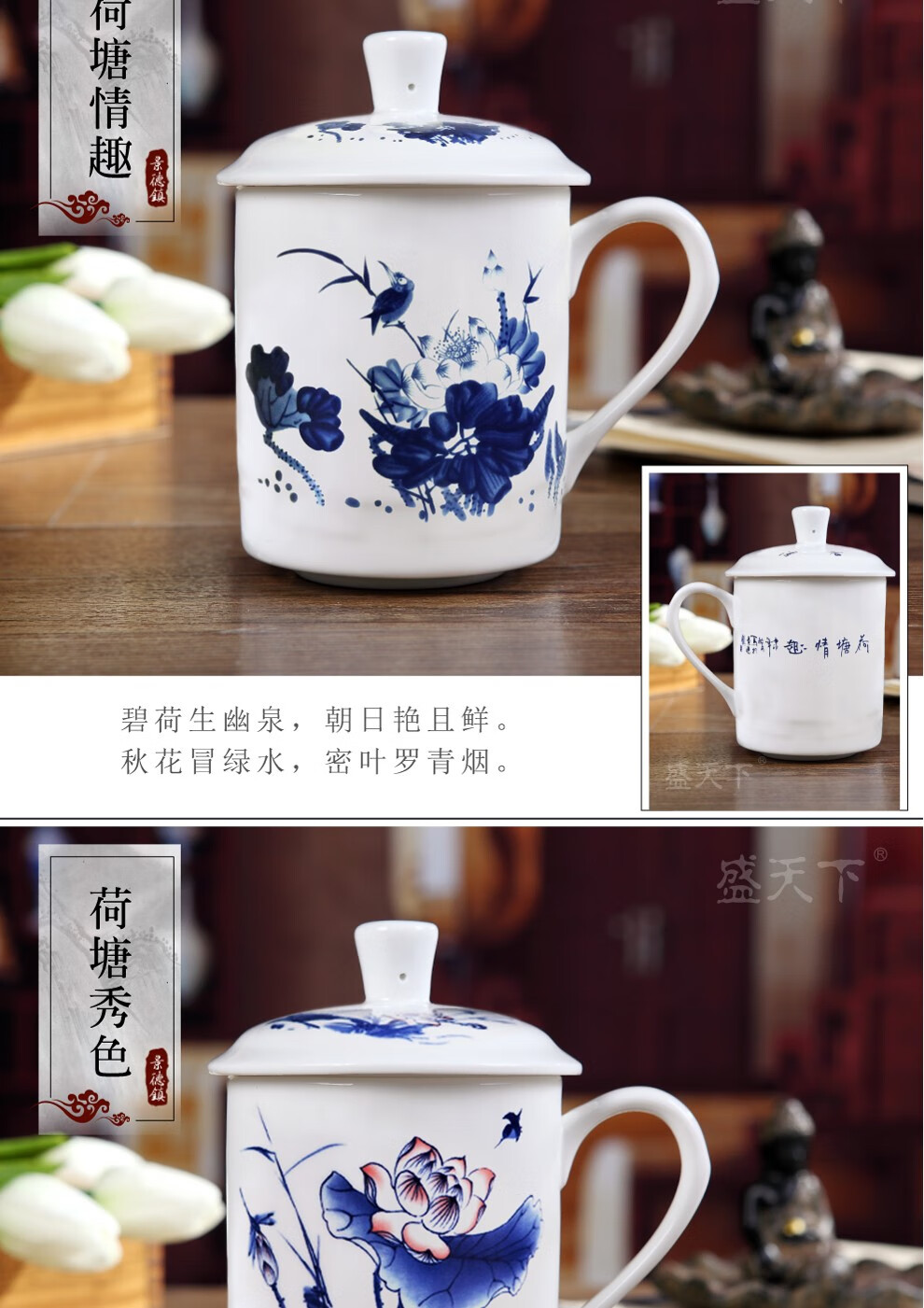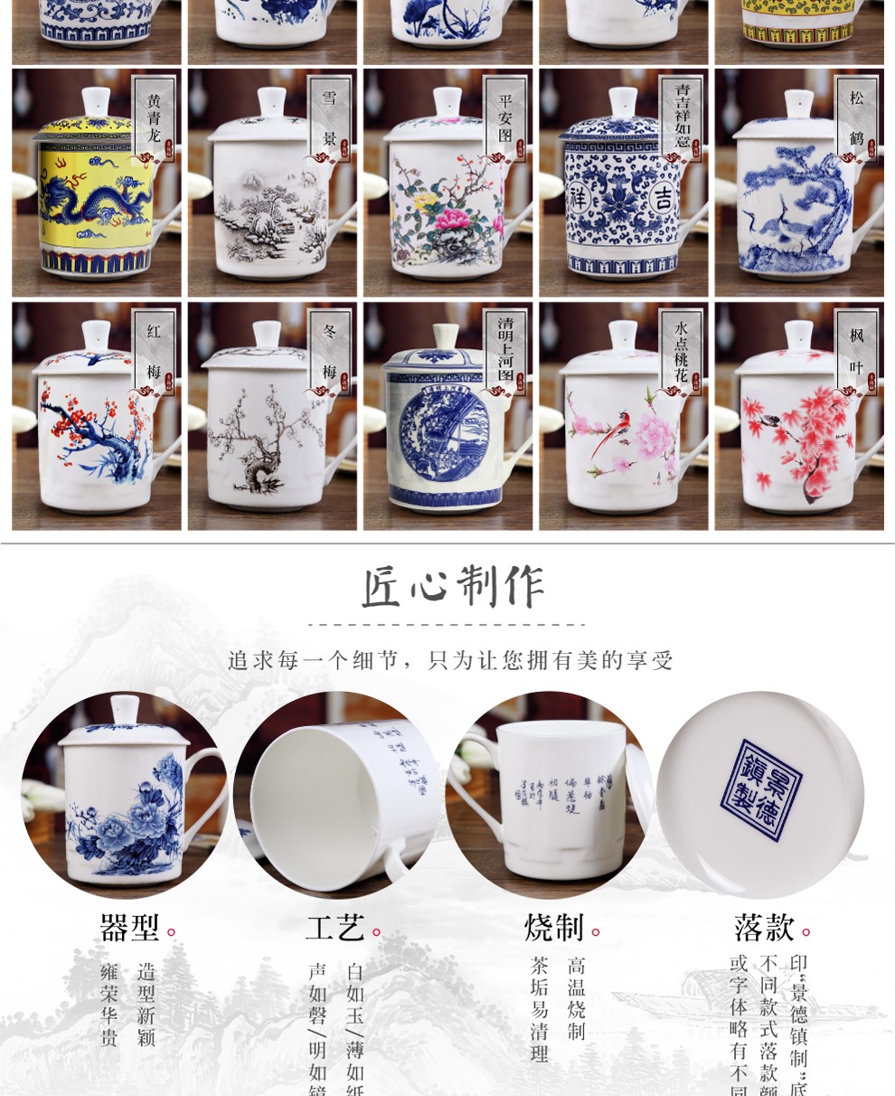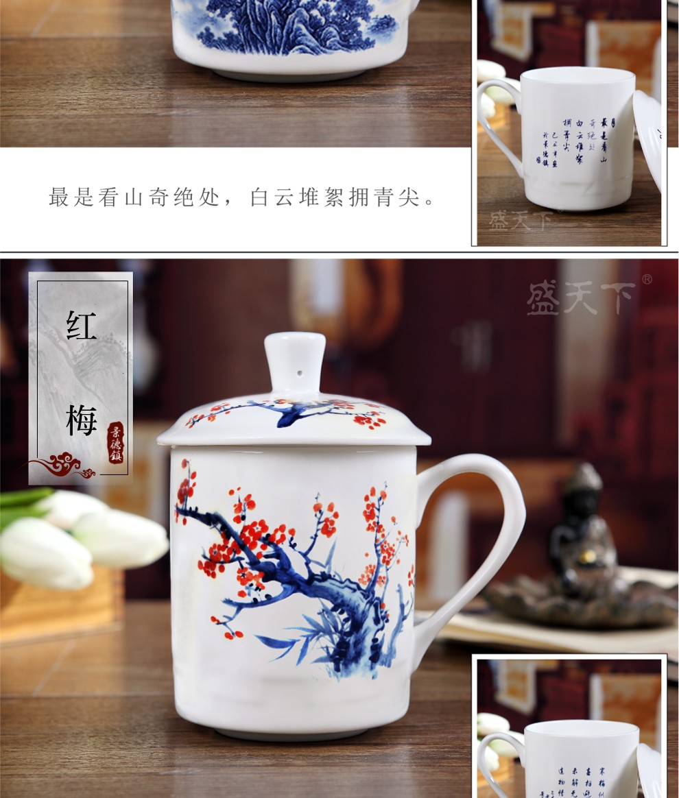 盛天下景德镇陶瓷茶杯带盖骨瓷杯青花水杯办公杯礼品杯会议杯子定制 青花牡丹 500ML