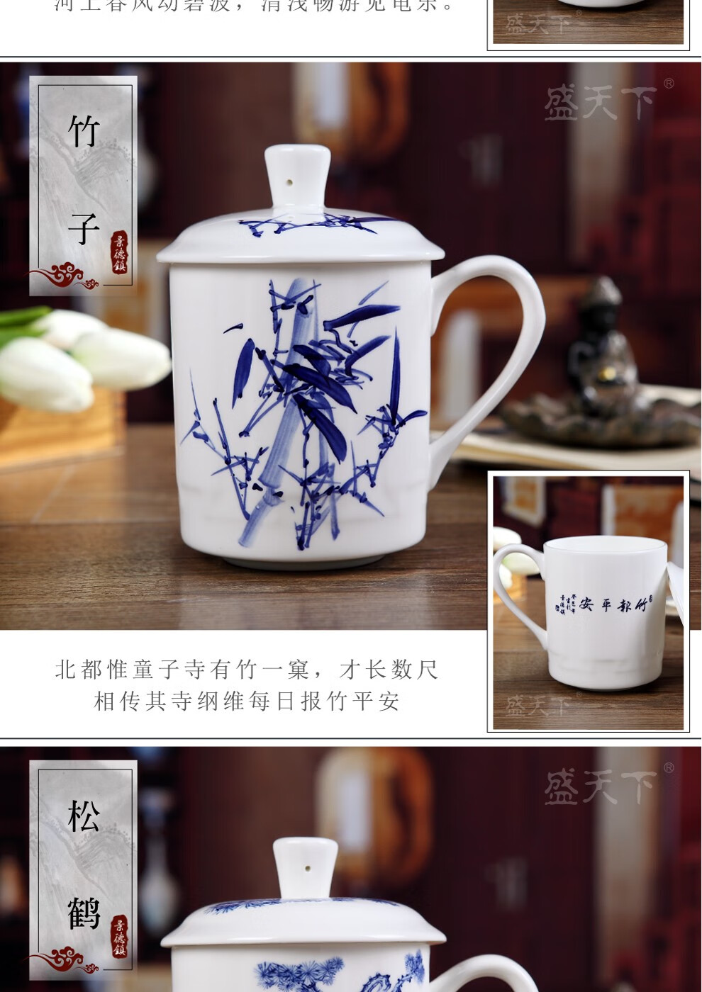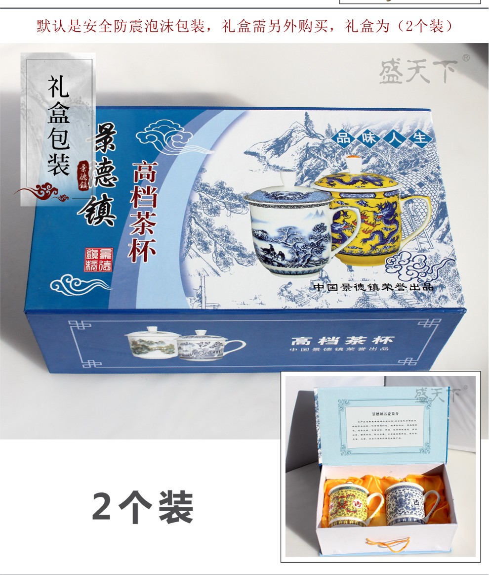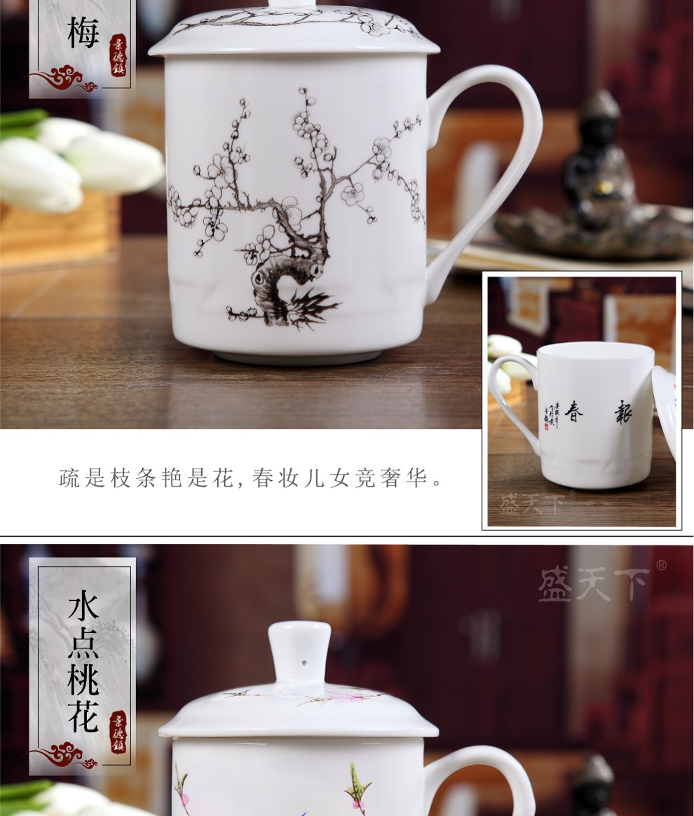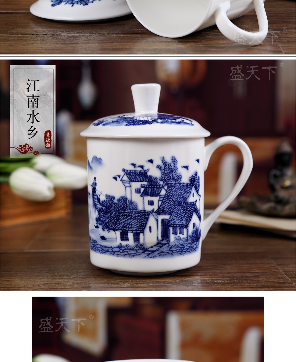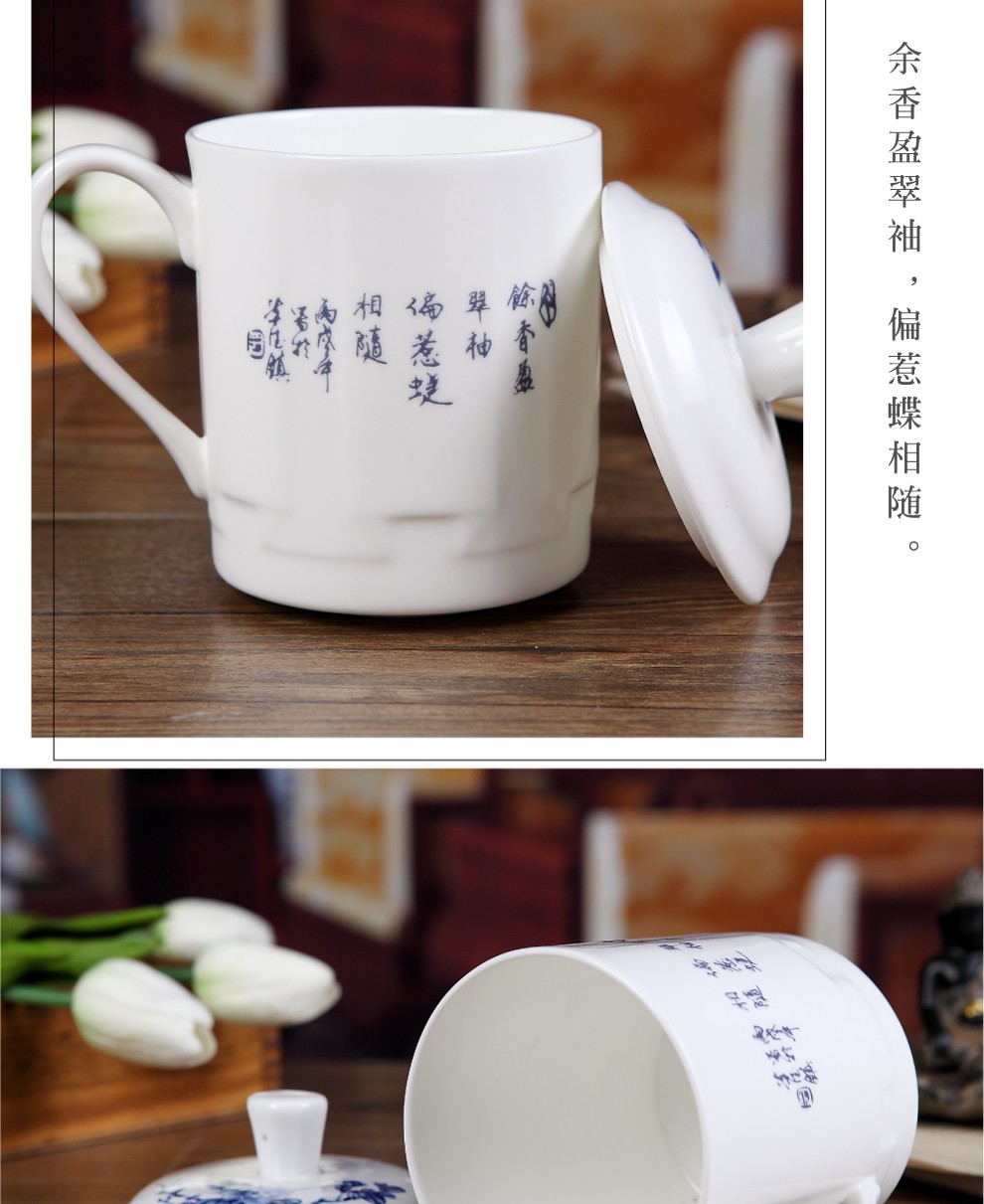 盛天下景德镇陶瓷茶杯带盖骨瓷杯青花水杯办公杯礼品杯会议杯子定制 青花牡丹 500ML
