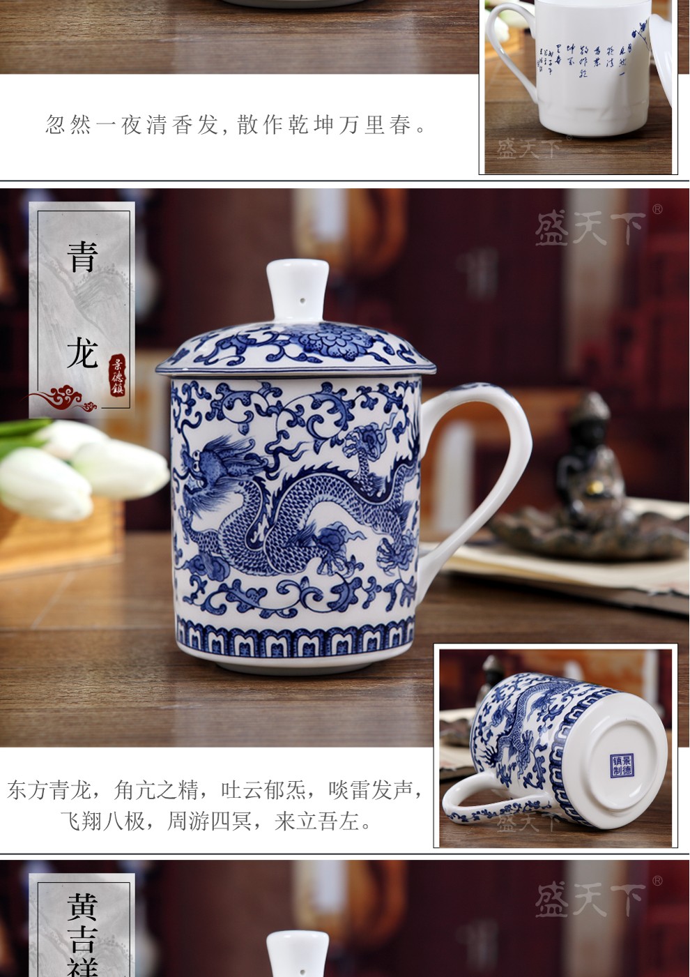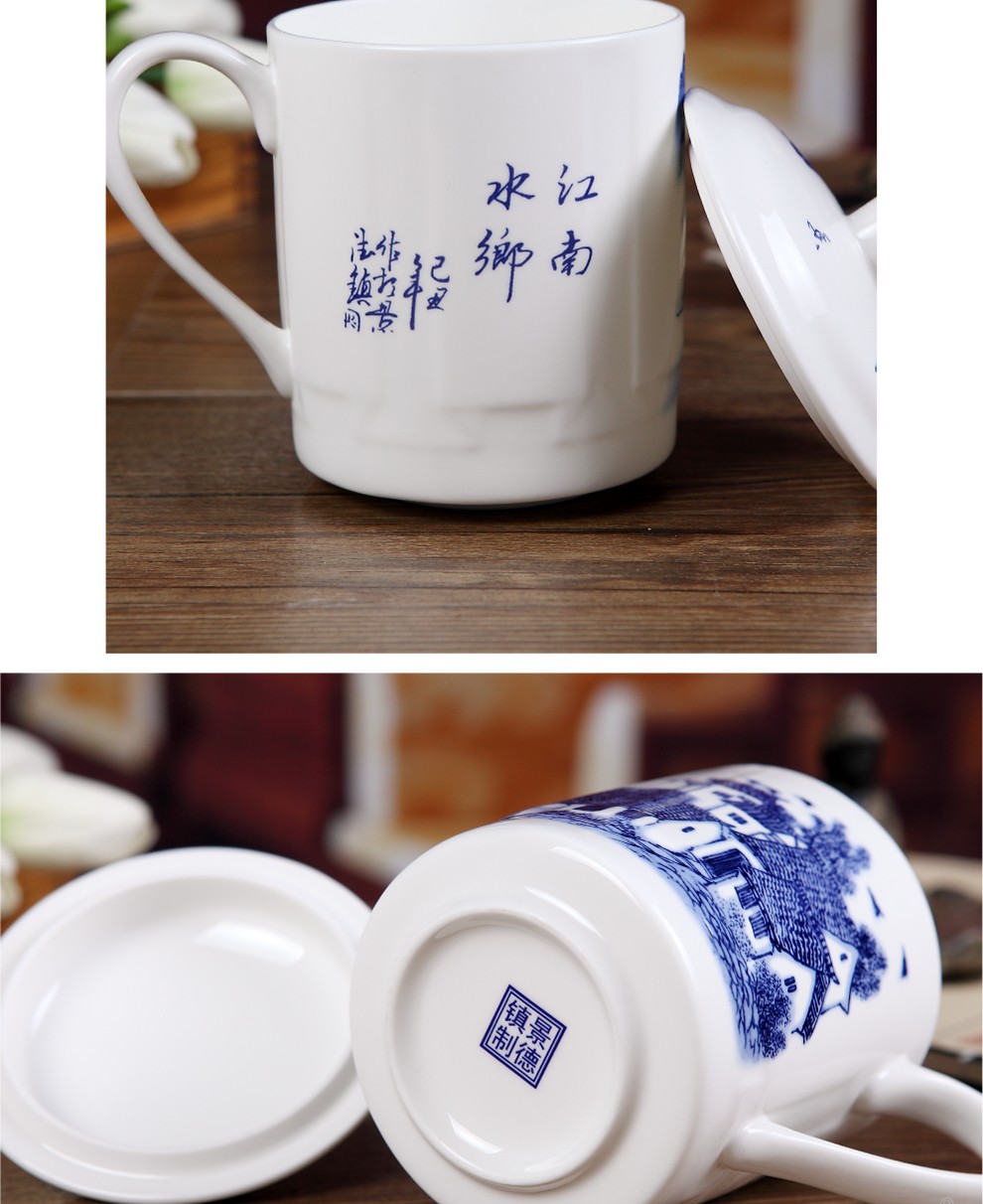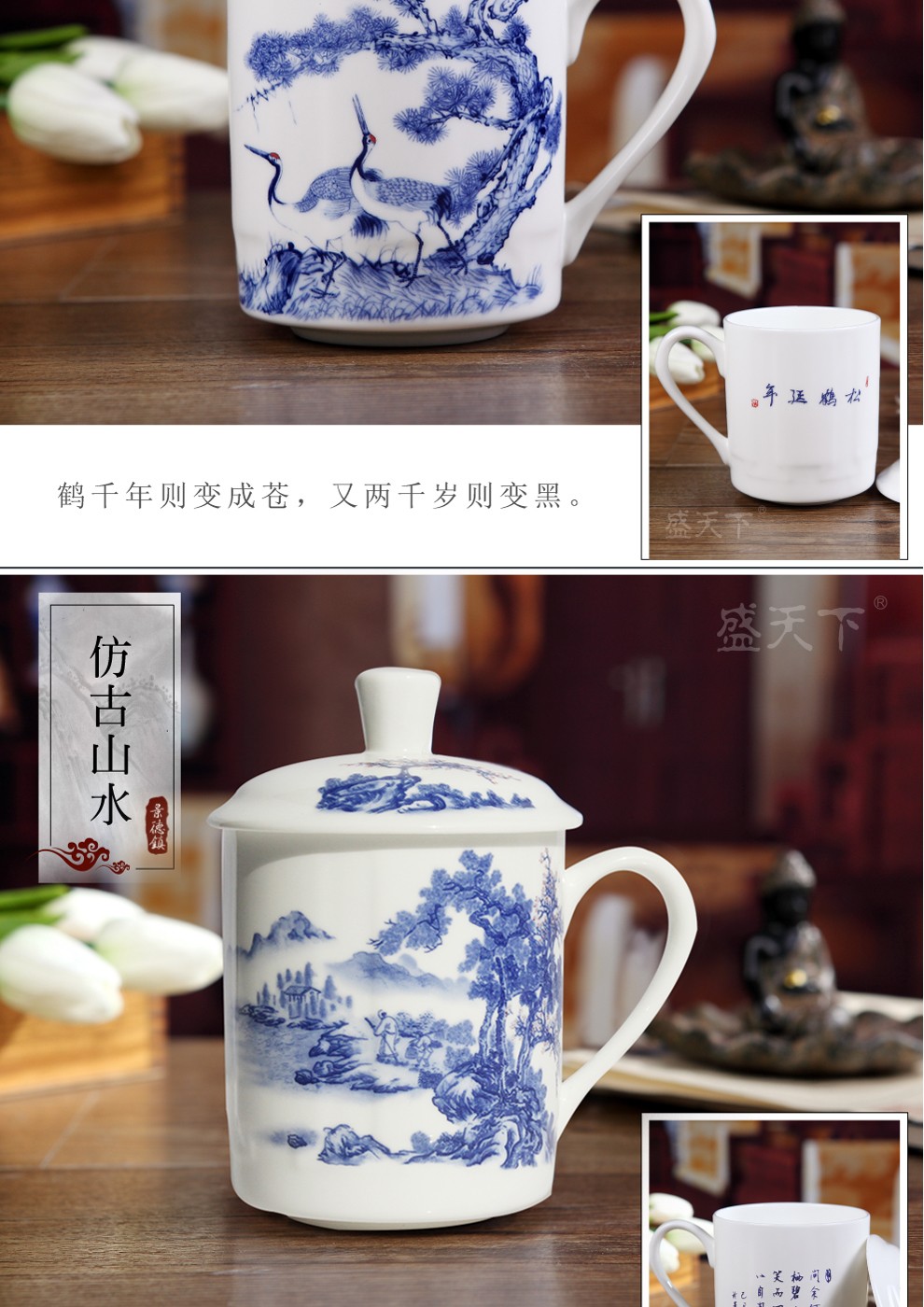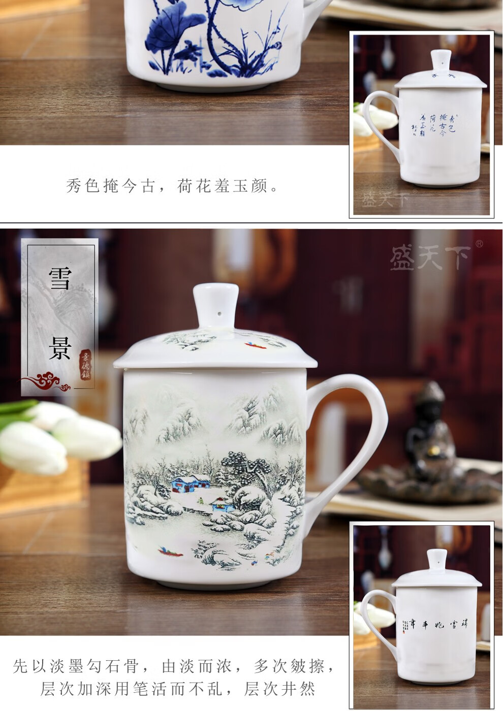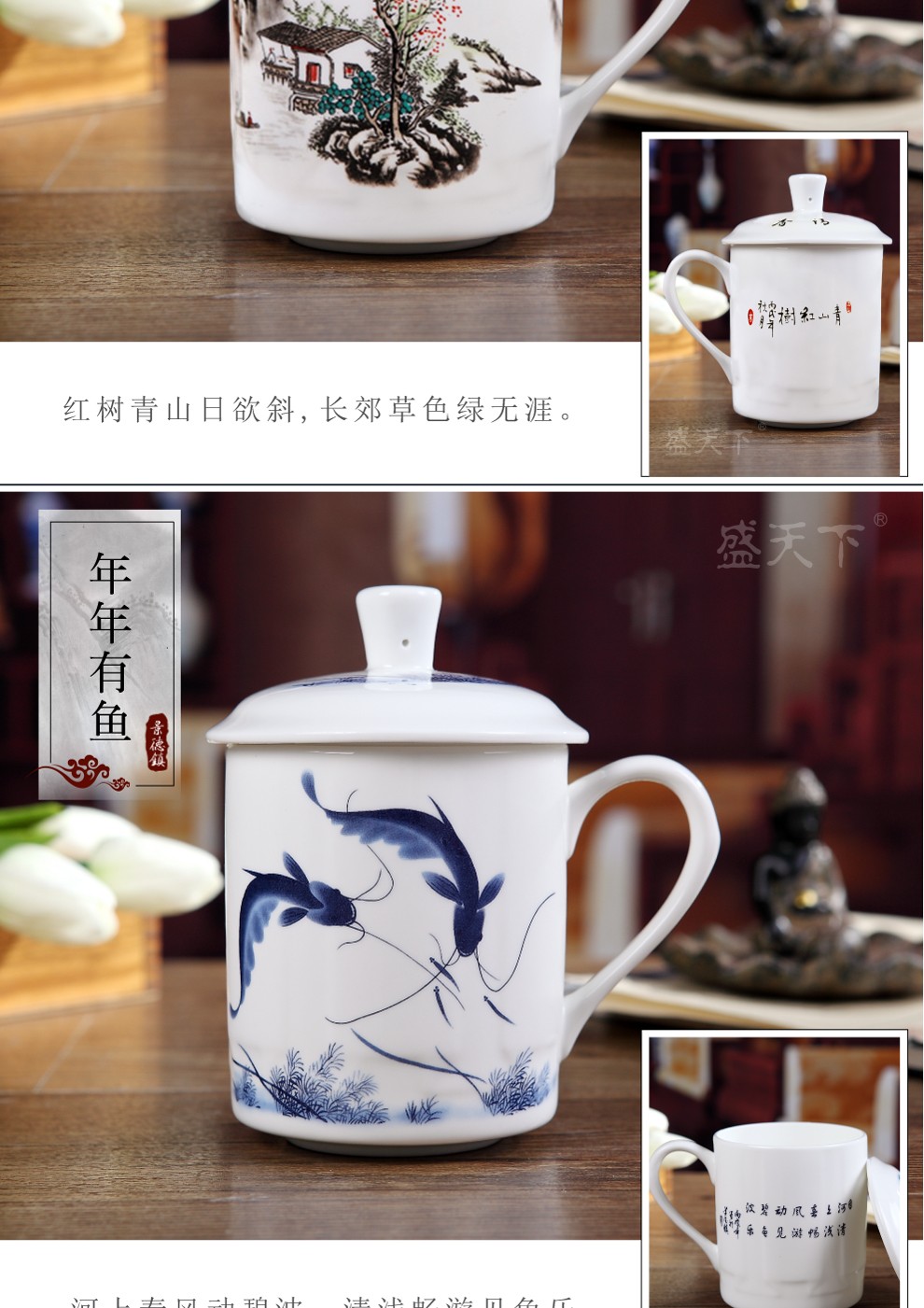 盛天下景德镇陶瓷茶杯带盖骨瓷杯青花水杯办公杯礼品杯会议杯子定制 青花牡丹 500ML