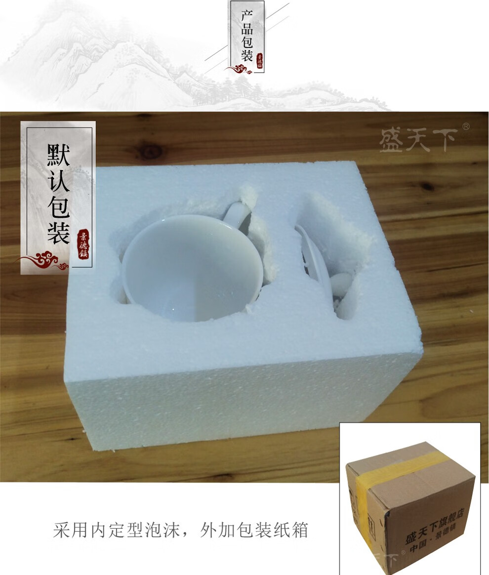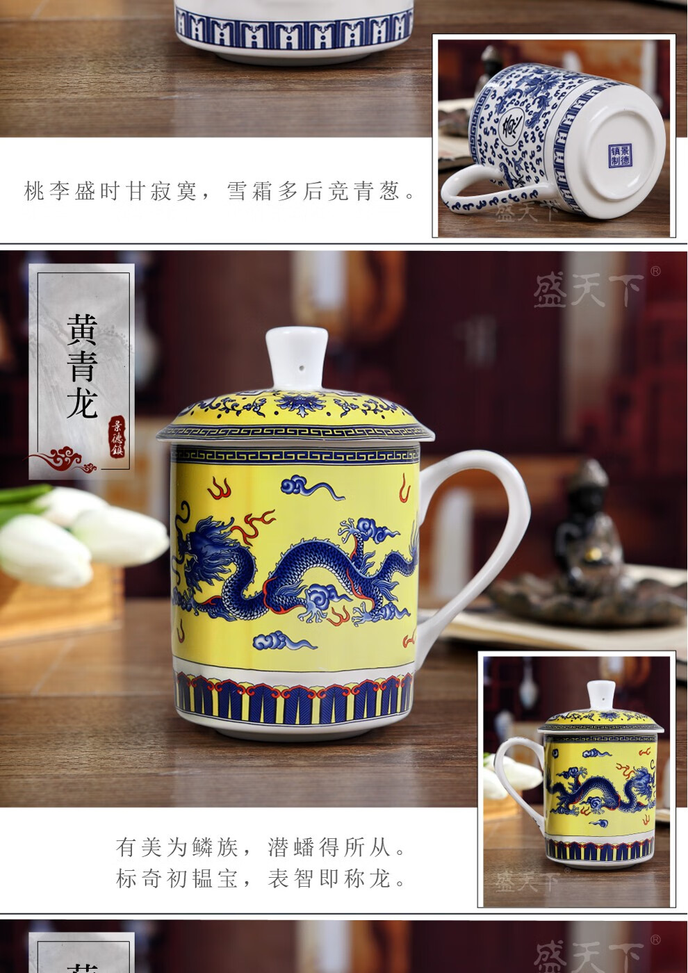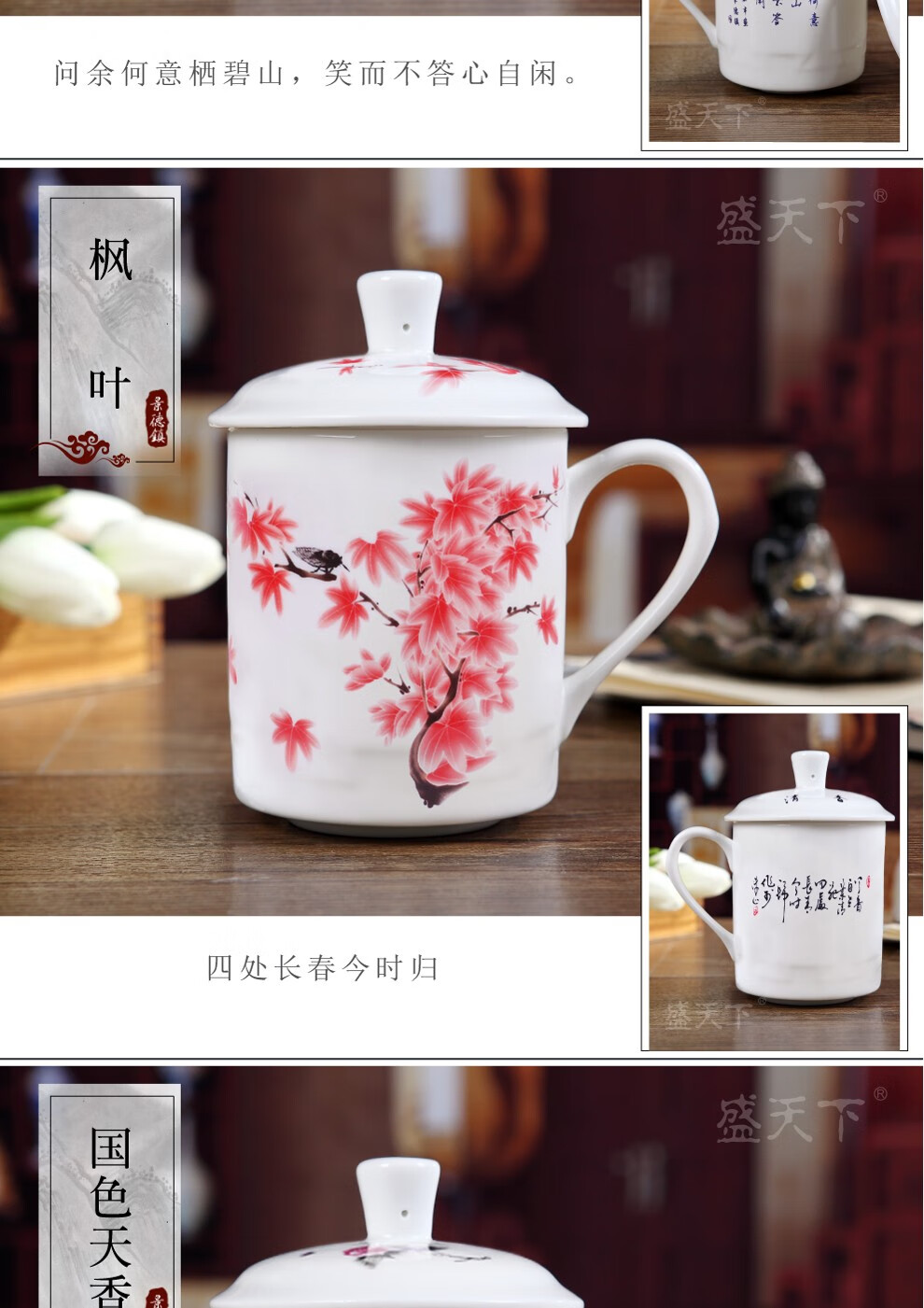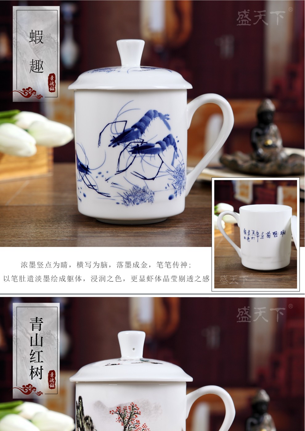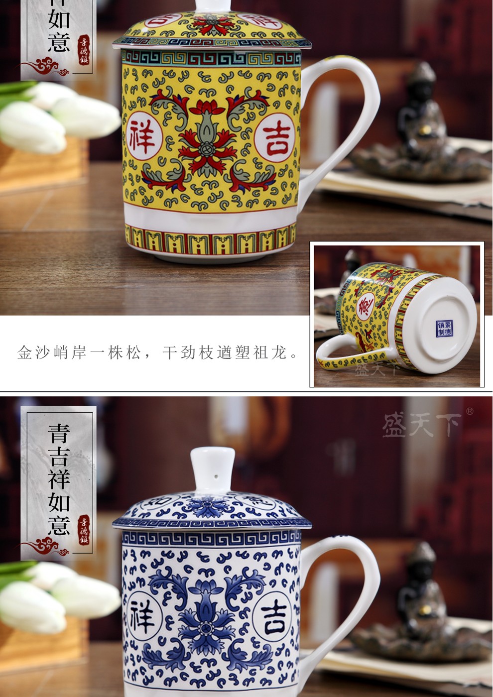 盛天下景德镇陶瓷茶杯带盖骨瓷杯青花水杯办公杯礼品杯会议杯子定制 青花牡丹 500ML