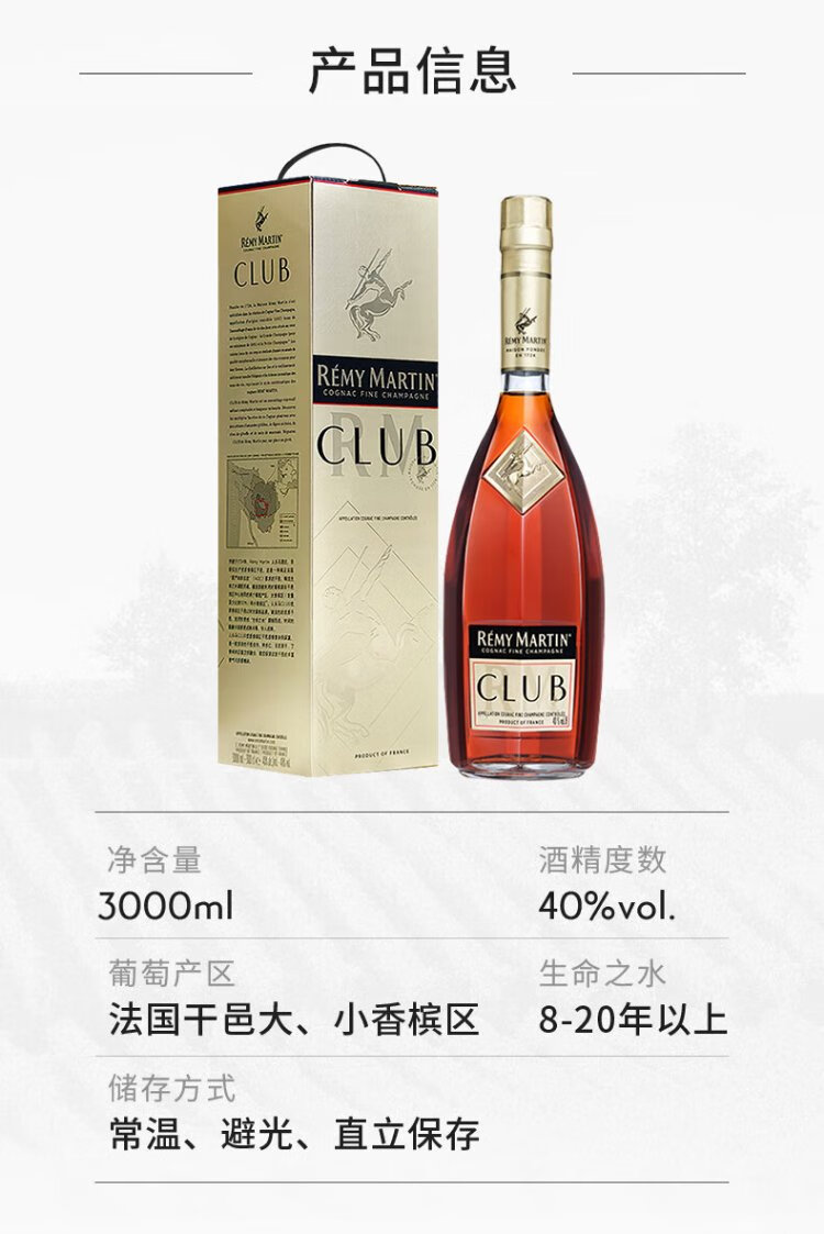 人头马(Remy Martin)宝树行 人头马CLUB3000ml 优质香槟区干邑白兰地 原装进口洋酒 3000mL 1瓶