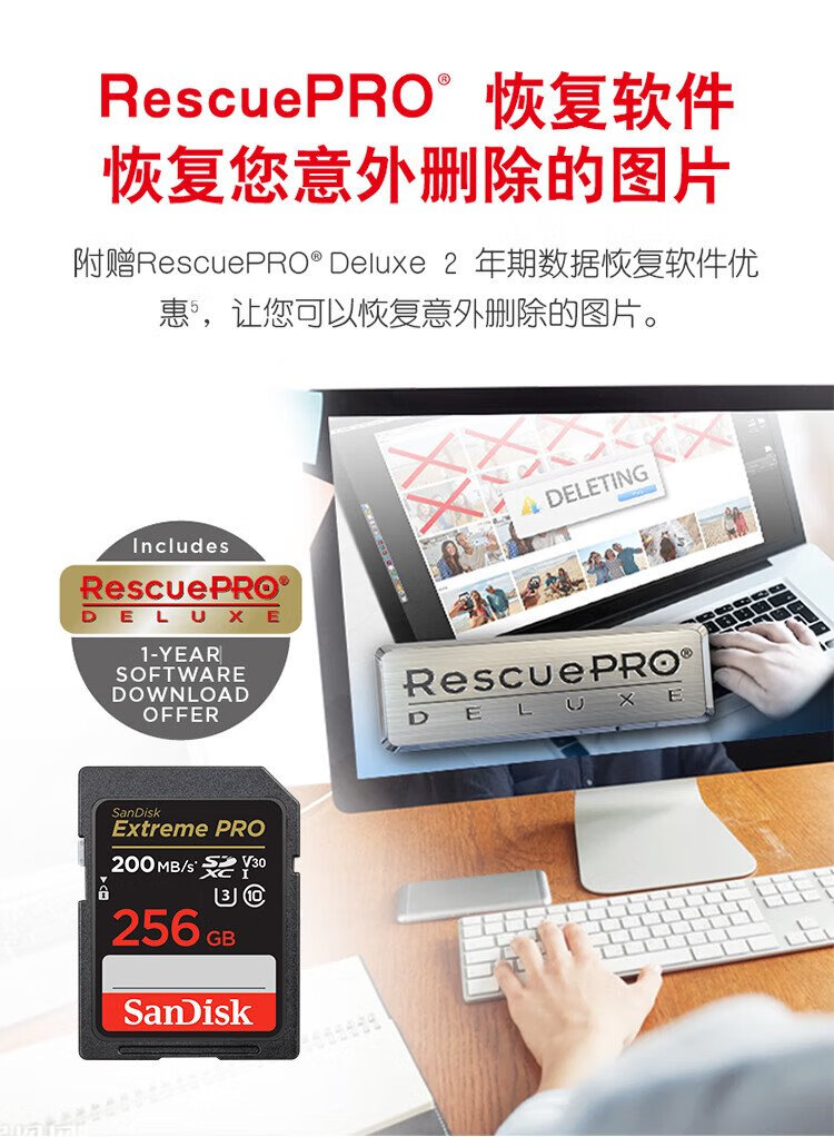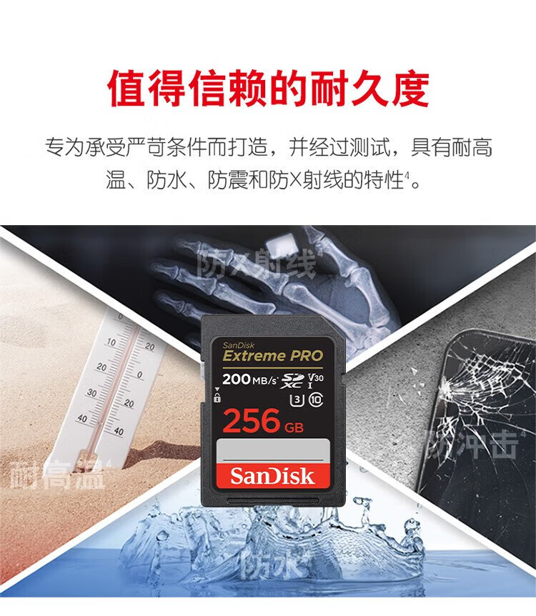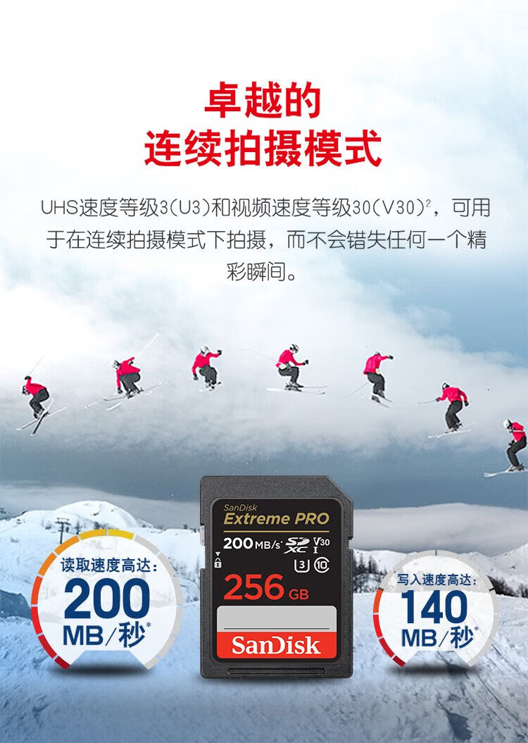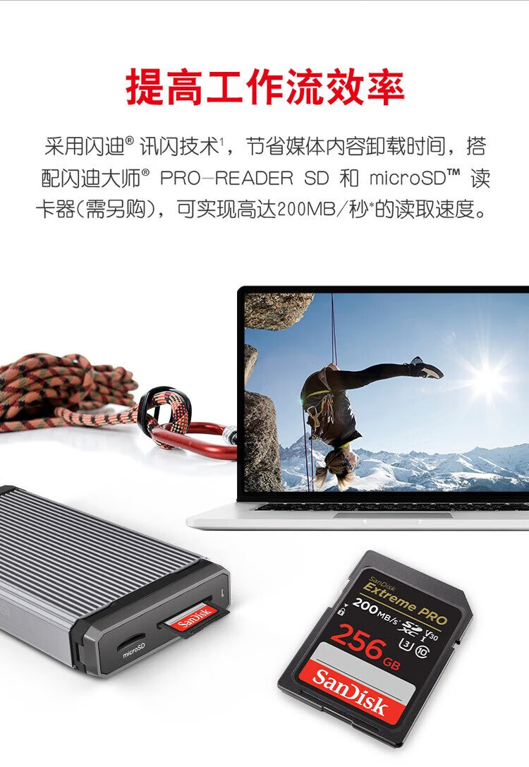 闪迪(SanDisk)256GB SD内存卡 4K V30 U3 C10 相机存储卡 读速200MB/s 写速140MB/s 微单/单反相机内存卡
