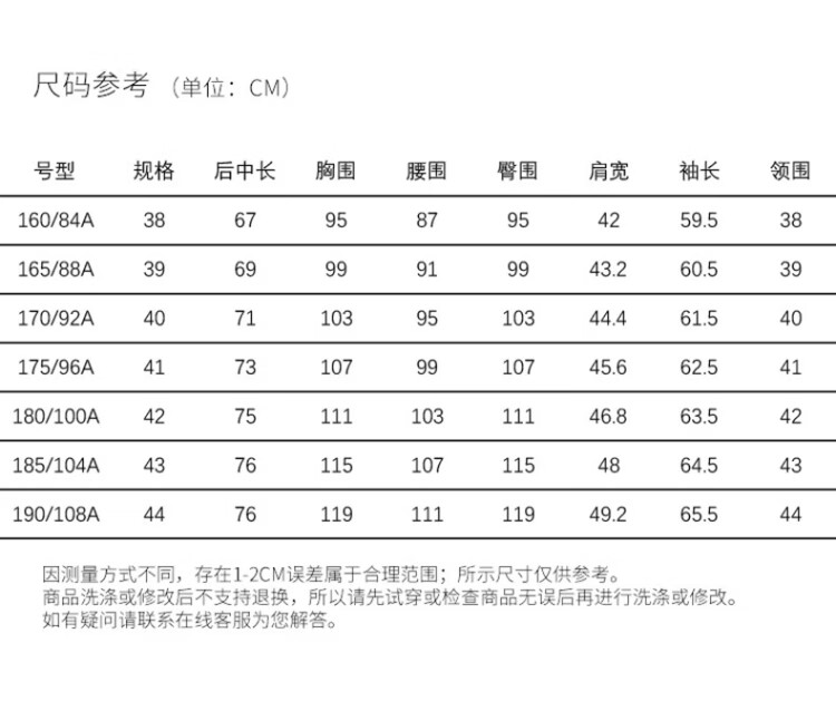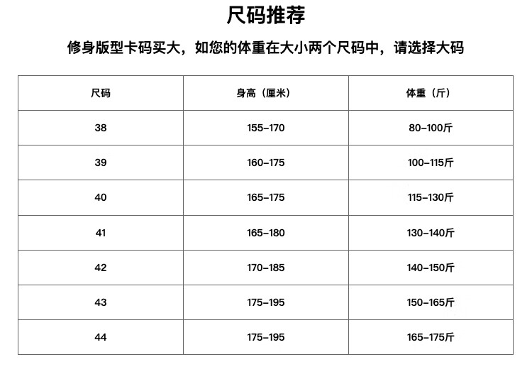 China (cm) 160-165/84-86 165-170 / 88-90 167-172 / 92-96 168-173 / 98-102 170-176 / 106-110