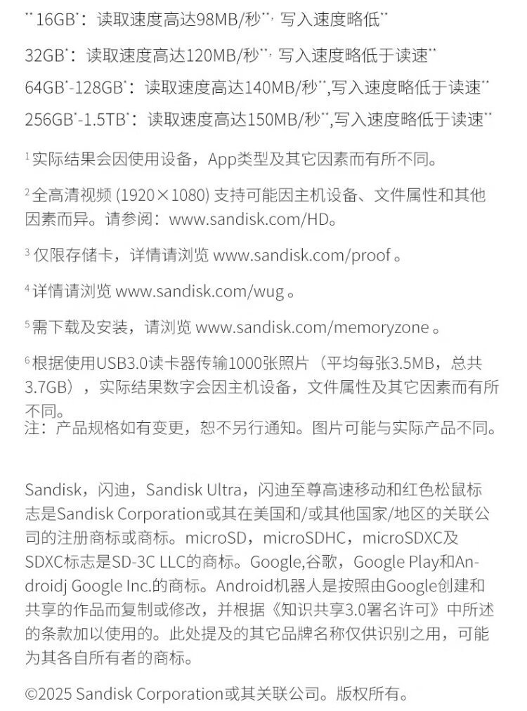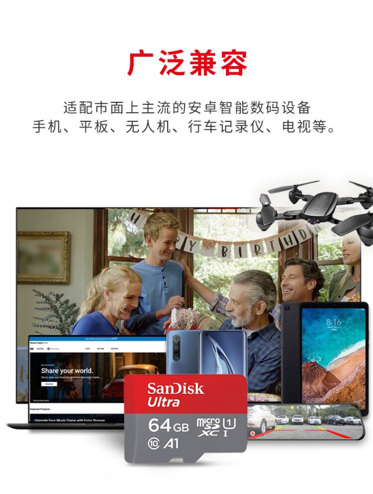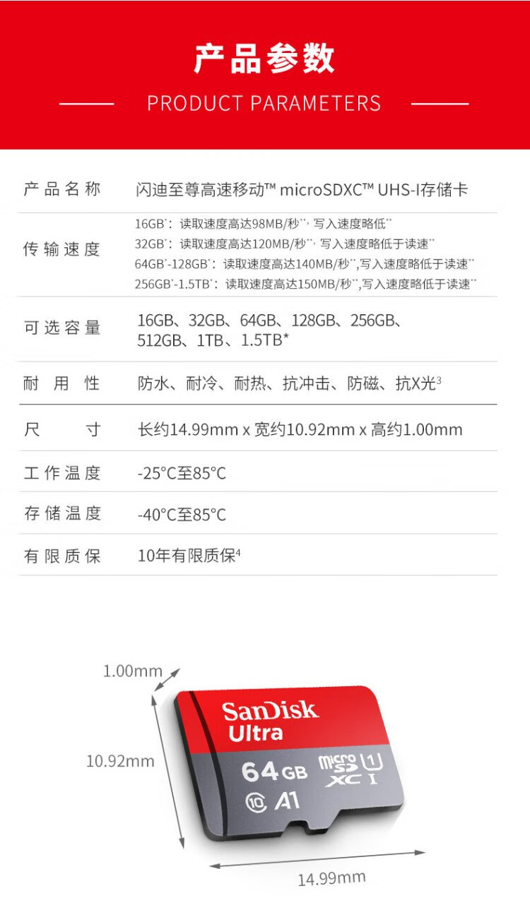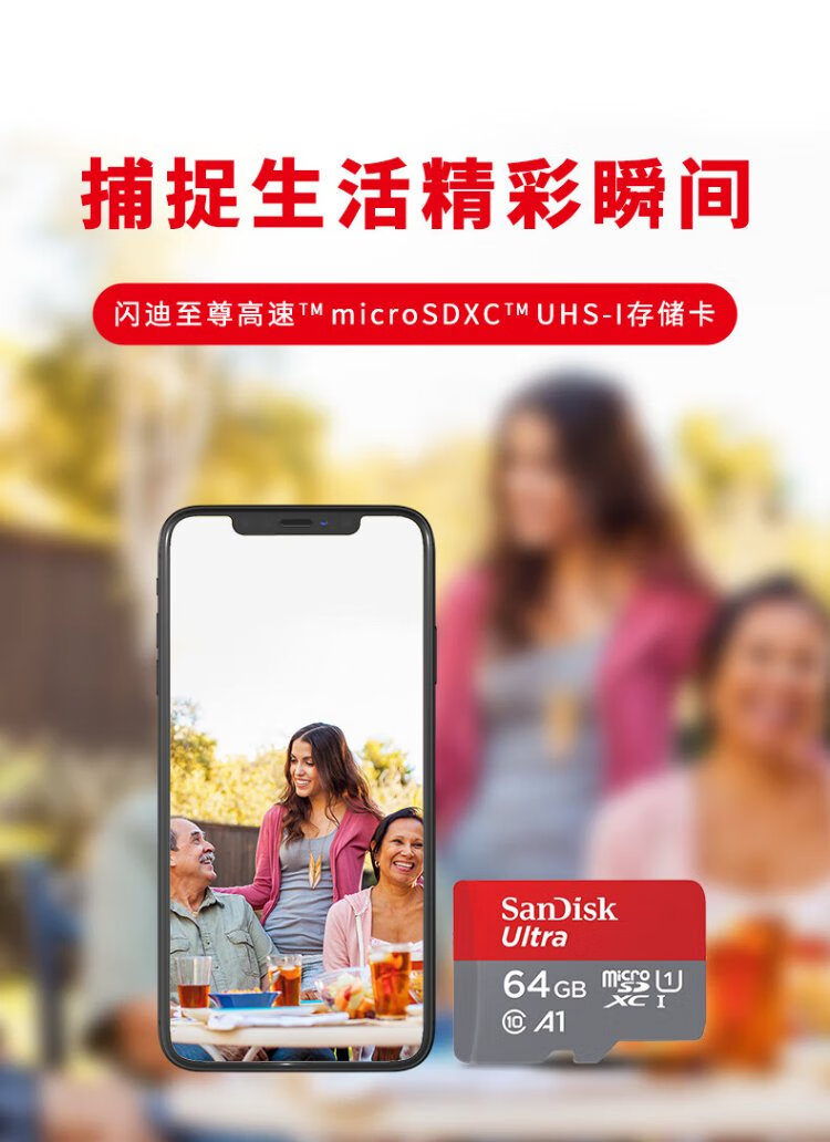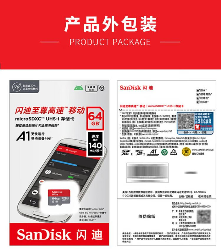 SanDisk 64GB TF (MicroSD) memory card A1 U1 C10 Extremely high-speed mobile version memory card, reading speed 140MB/s mobile phone tablet game console memory card