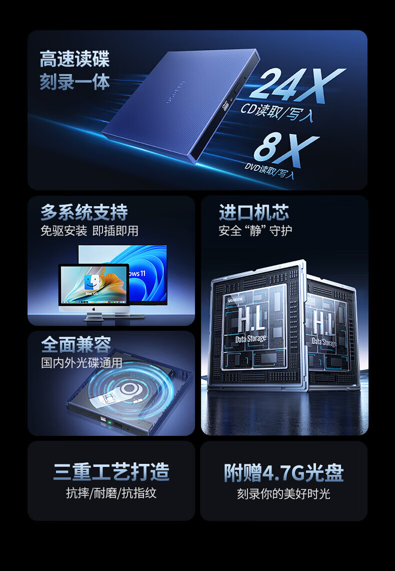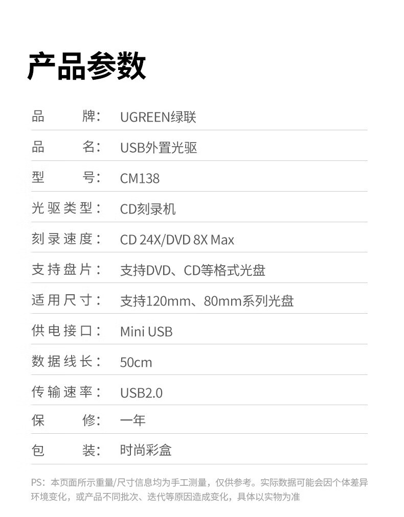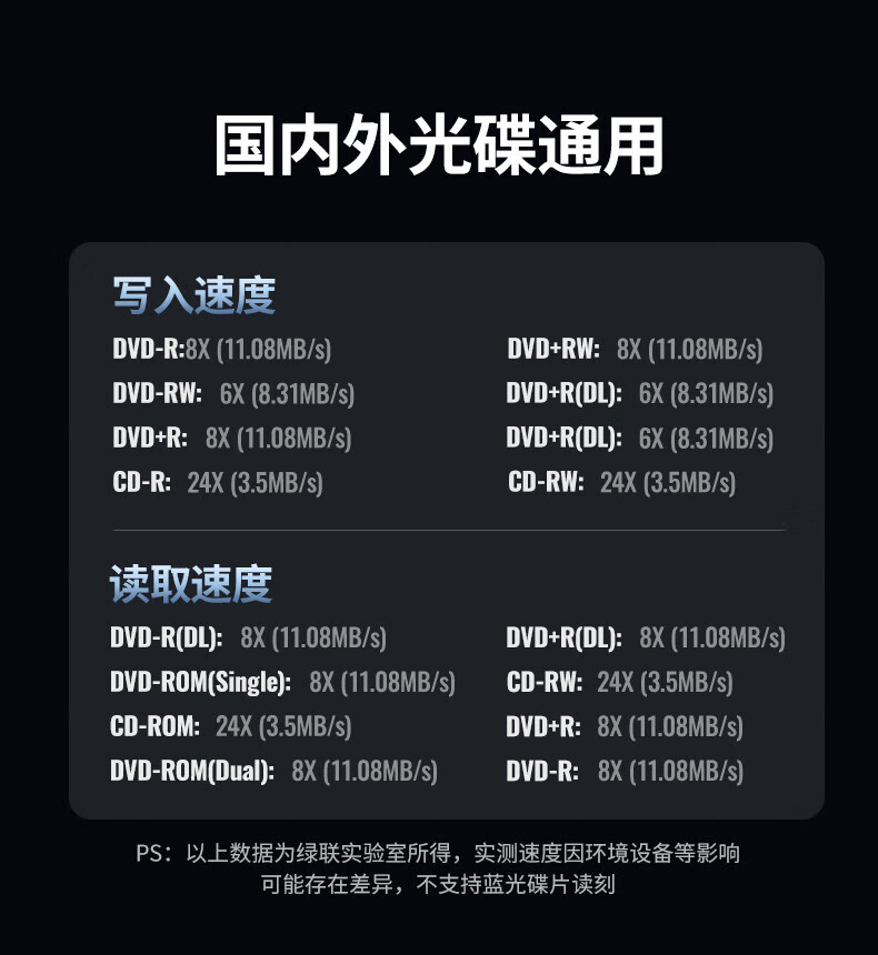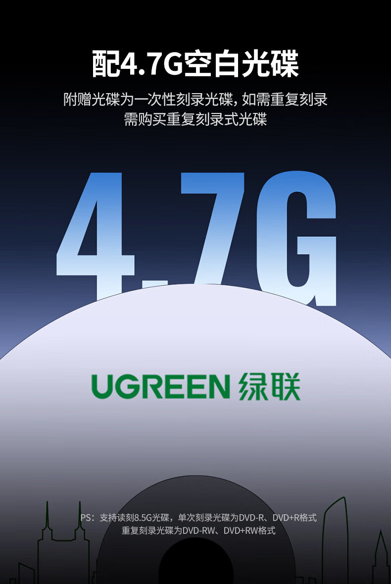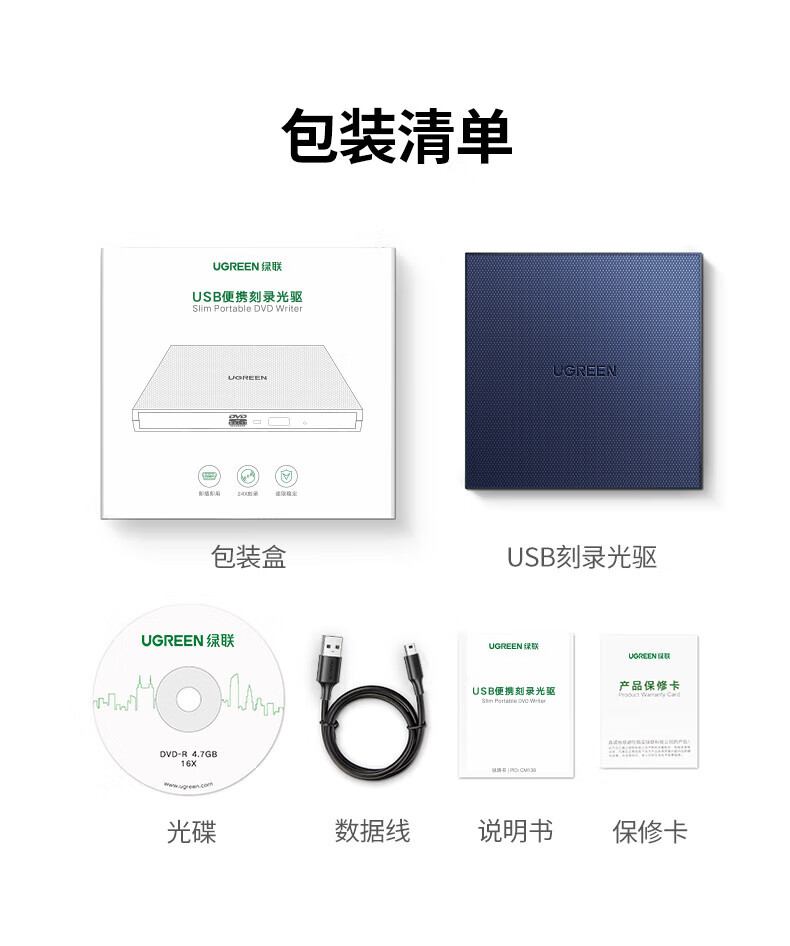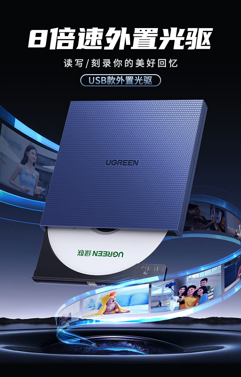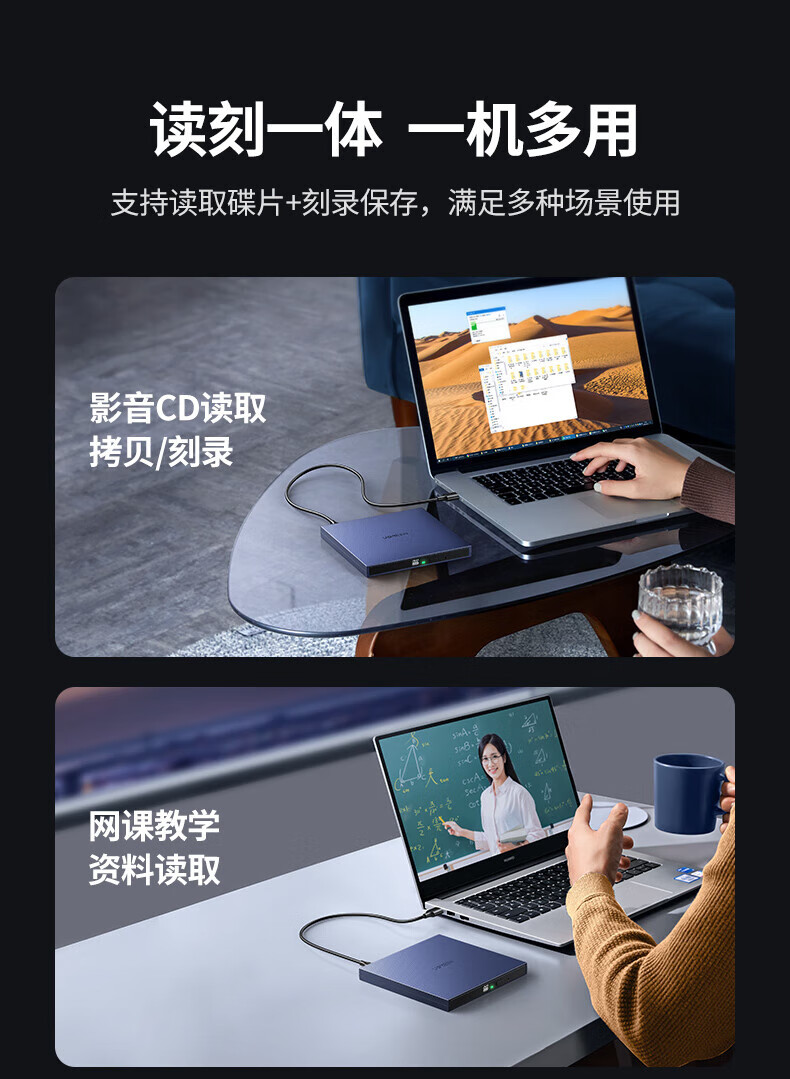 绿联USB外置移动光驱 DVD CD光盘刻录机 适用台式电脑笔记本外接光驱 双接口8倍速 40576 USB款 免装驱动 USB2.0