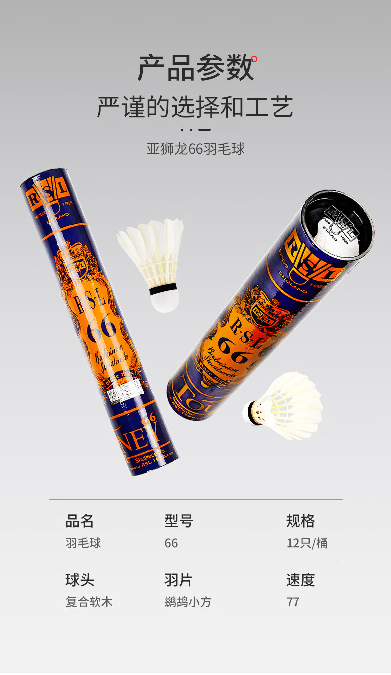 亚狮龙(RSL)训练比赛用球 飞行稳定耐打 RSL66号 羽毛球(1桶装)