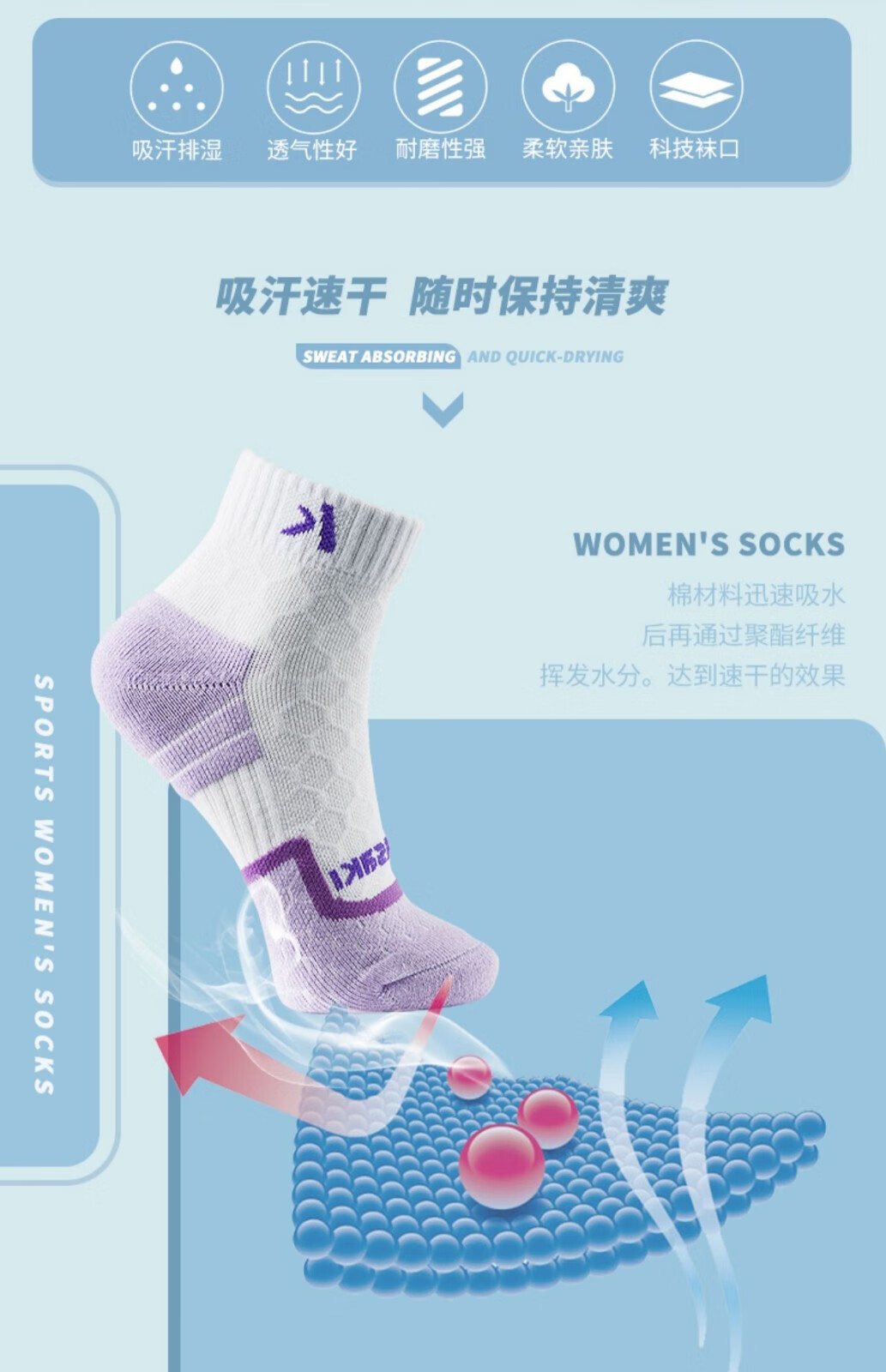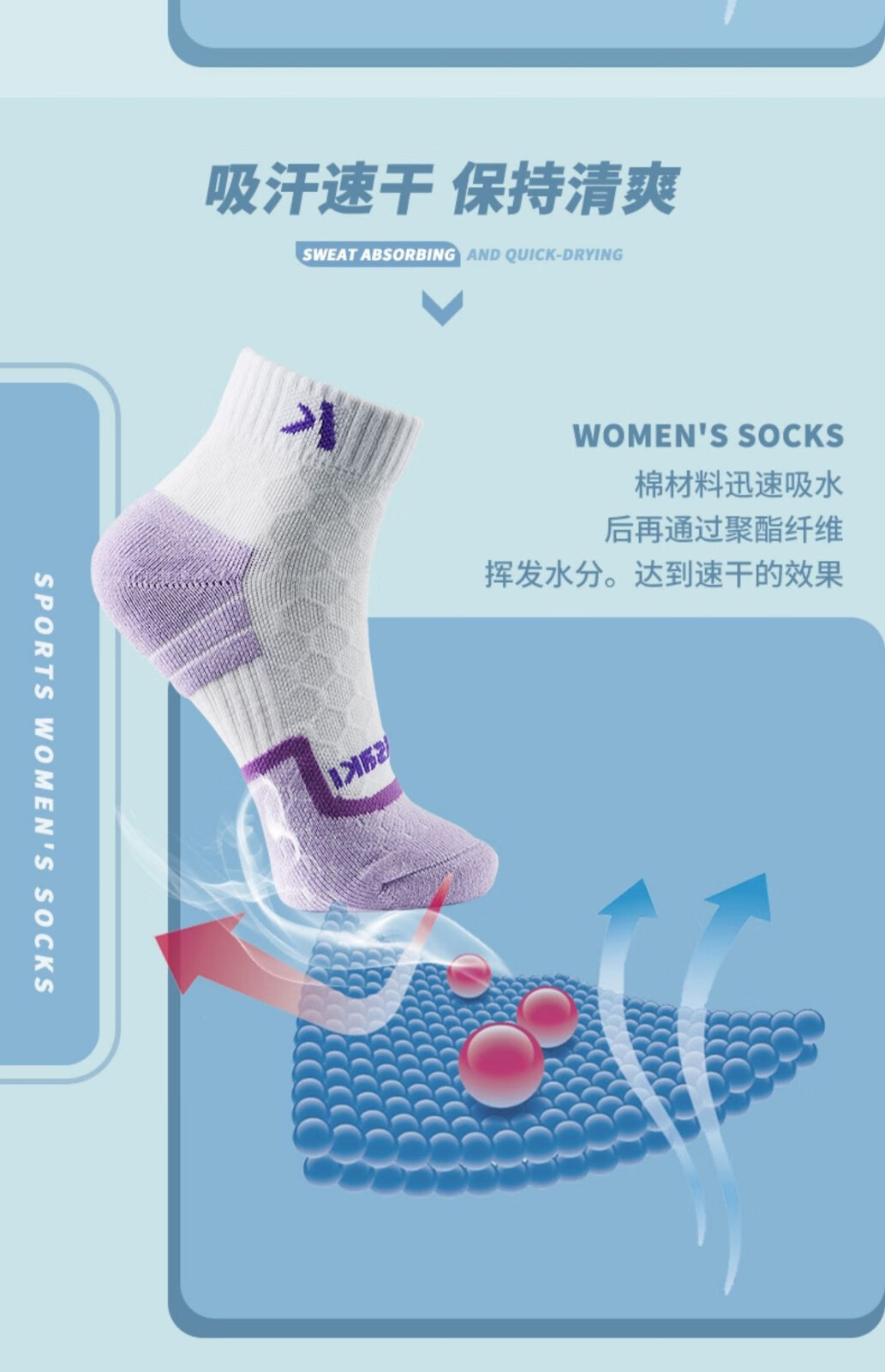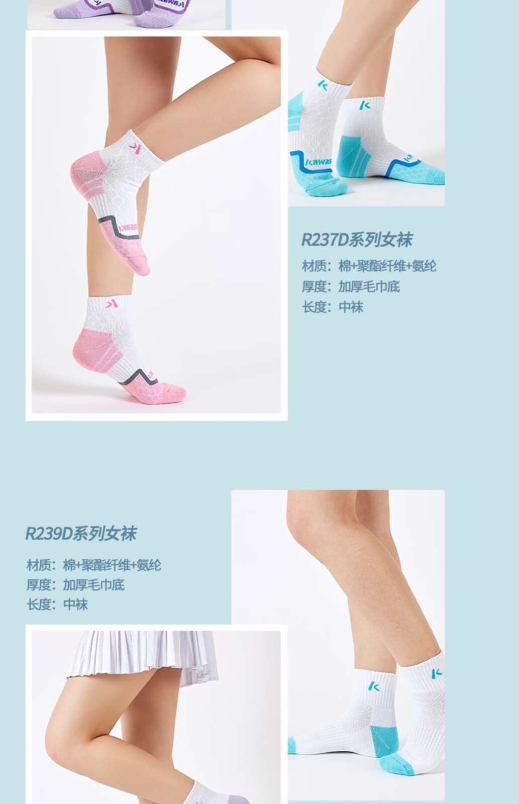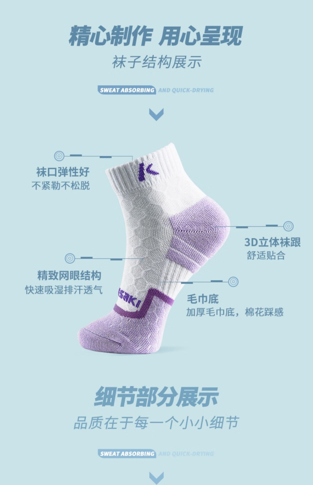 川崎(KAWASAKI)羽毛球运动袜女款跑步健身中短女袜子毛巾底吸汗透气3双装 R237D蓝/粉/紫(3双装)