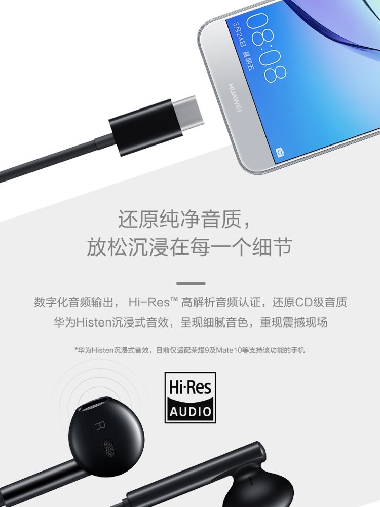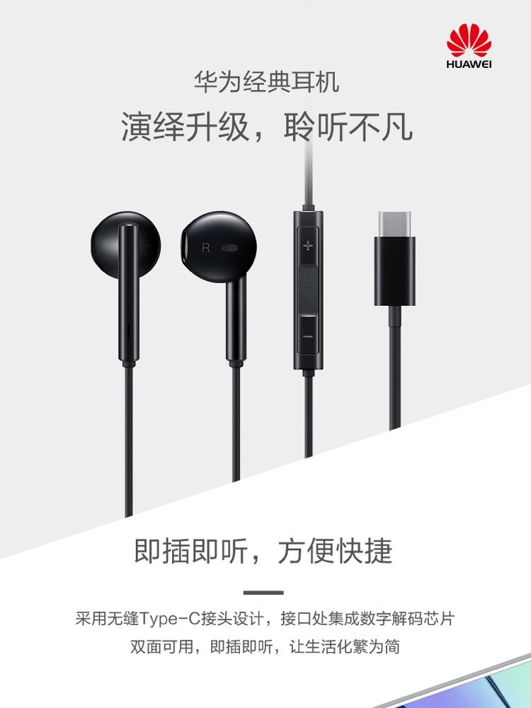 华为(HUAWEI)原装Type-C耳机华为经典耳机 黑色适用于华为P20 Pro/P20/Mate10 Pro/Mate10系列等手机CM33