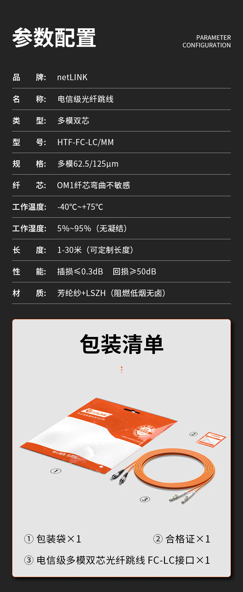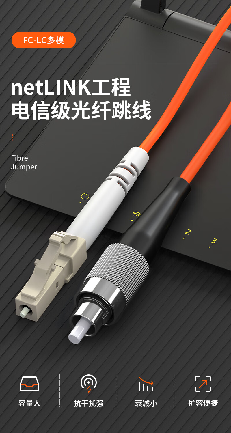 netLINK 电信级光纤跳线 FC-LC(UPC)多模双芯3米 62.5/125环保入户光纤线 收发器尾纤 1条 HTF-FC-LC/MM-3