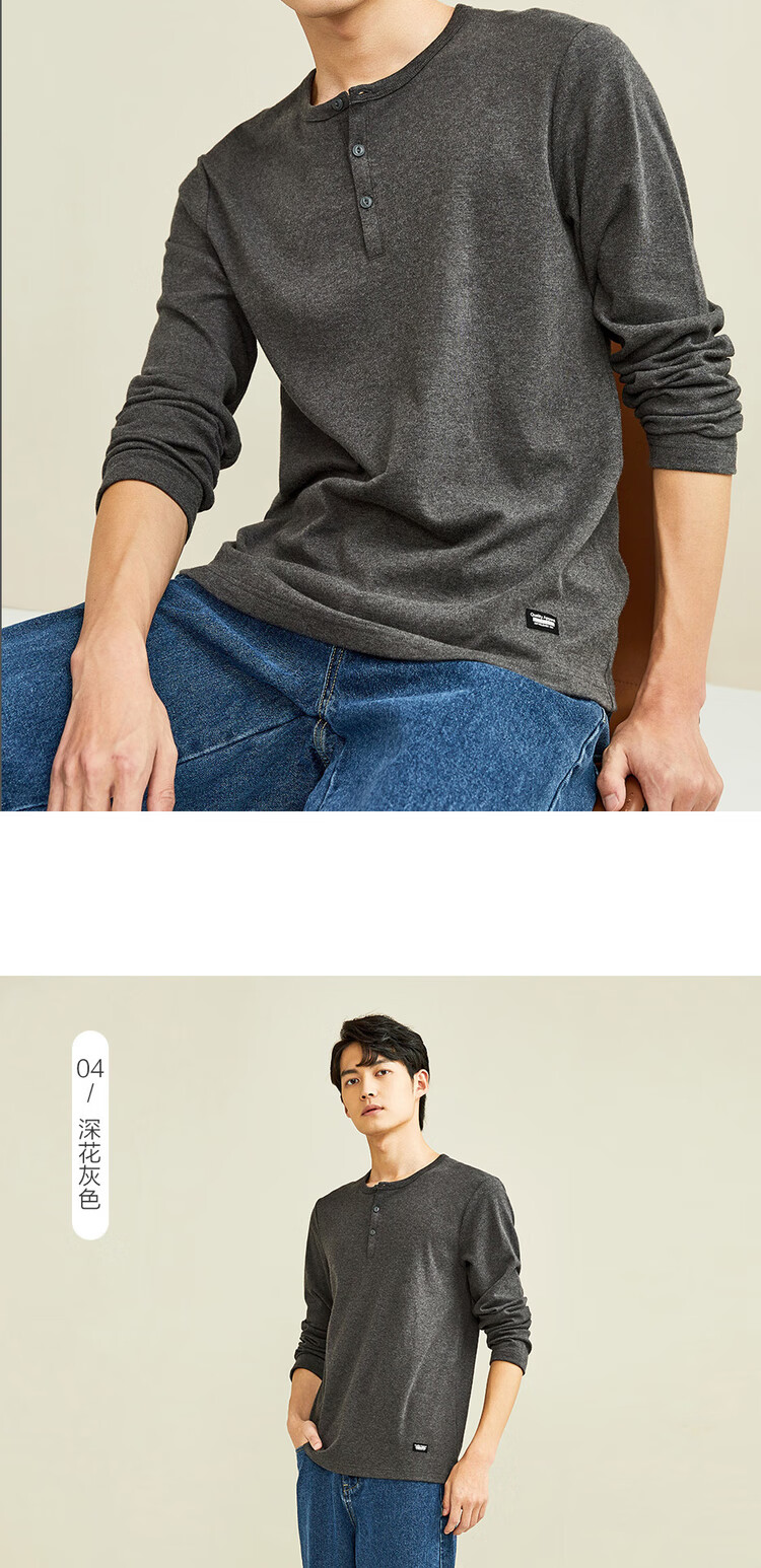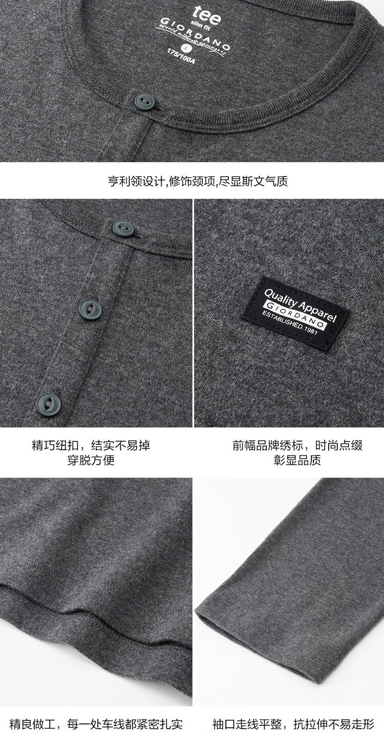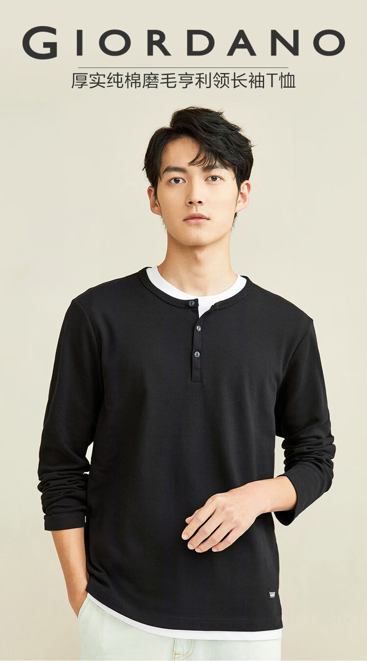 Camiseta Giordano, camiseta henley informal de color sólido para hombre, camiseta de manga larga cepillada de algodón puro grueso para hombre 01022803