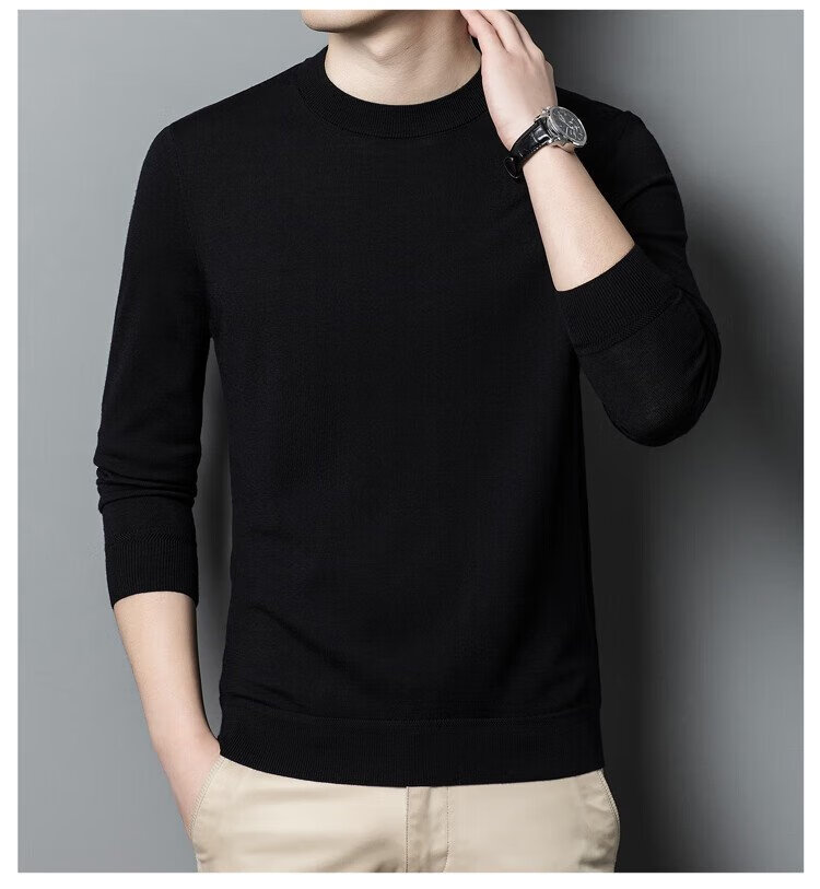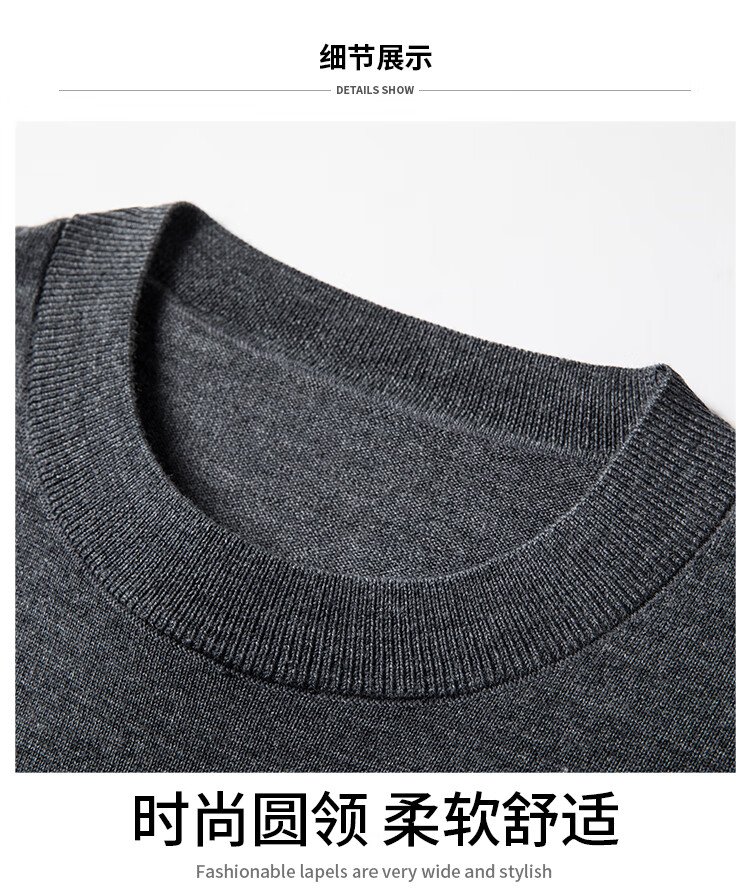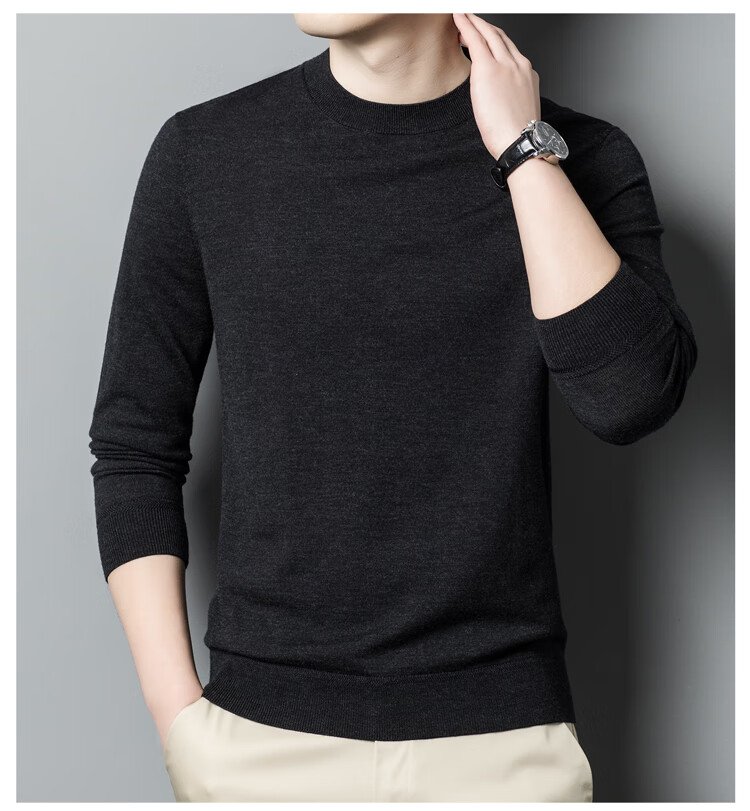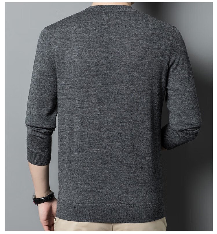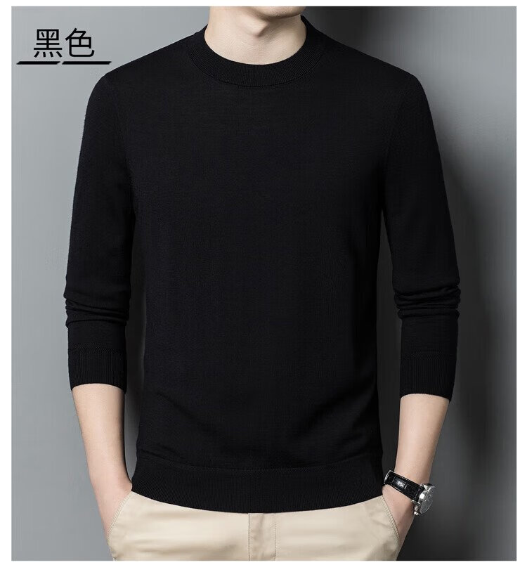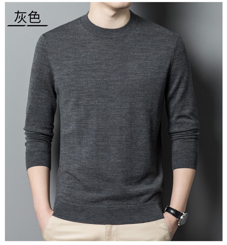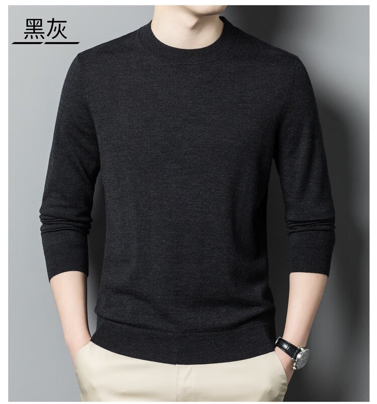 恒源祥100%精纺羊毛衫男可机洗 秋冬套头薄款毛衣男士圆领针织衫商务休闲纯色全羊毛衣服 20007001 黑灰 175