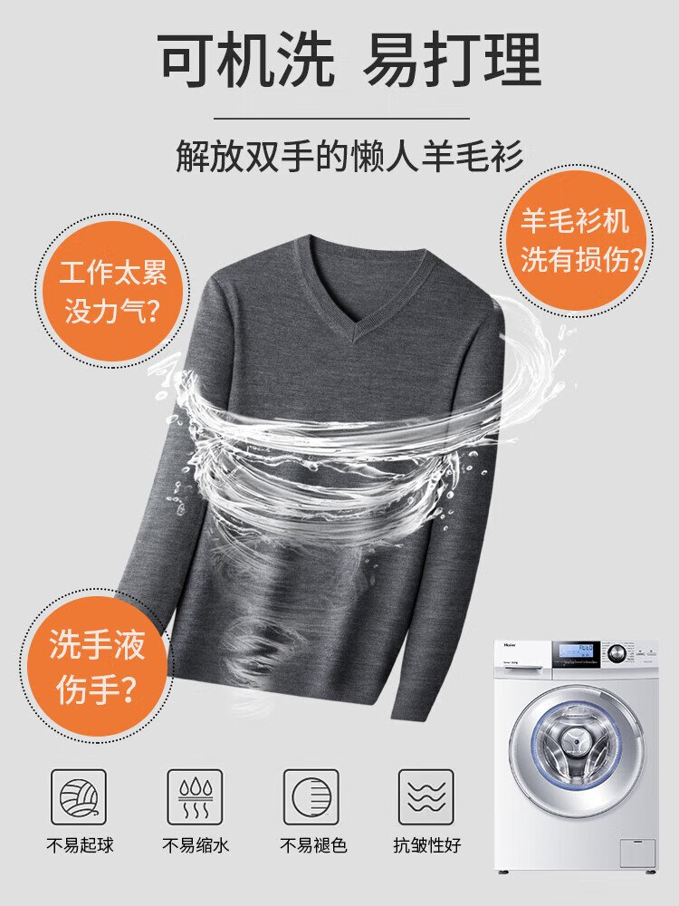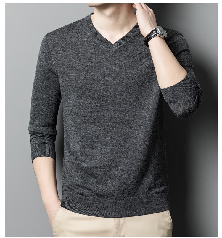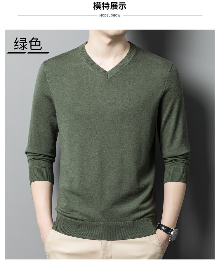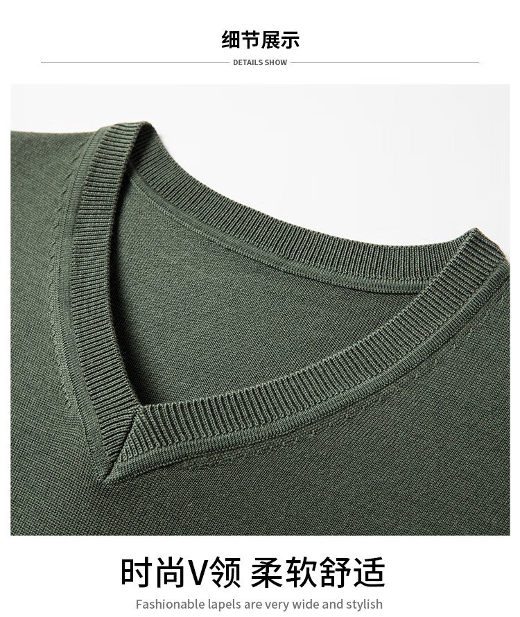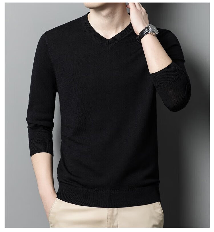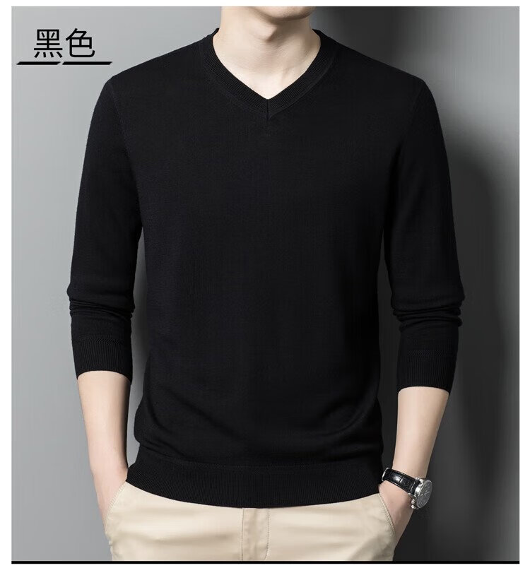 恒源祥100%精纺羊毛衫男可机洗 秋冬套头薄款毛衣男士V领针织衫商务休闲纯色全羊毛衣服 20007003 黑色 175