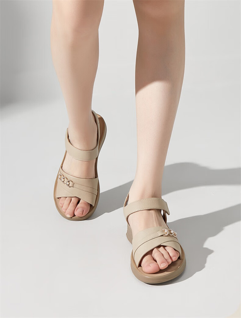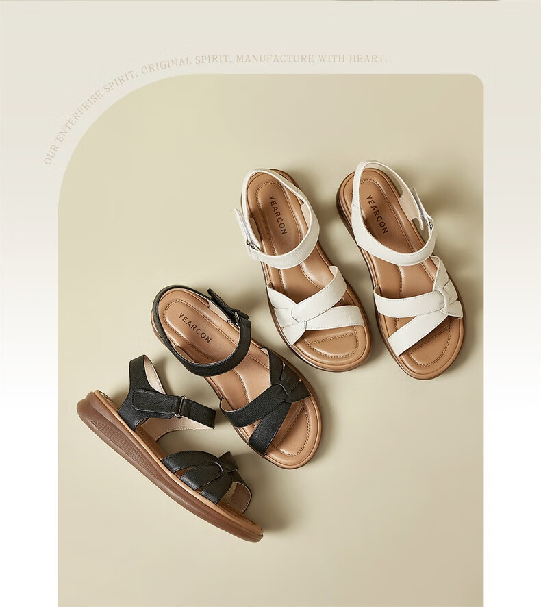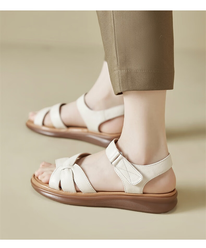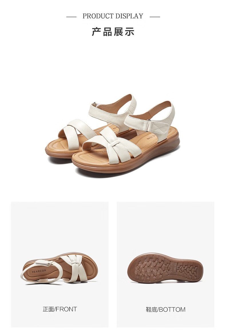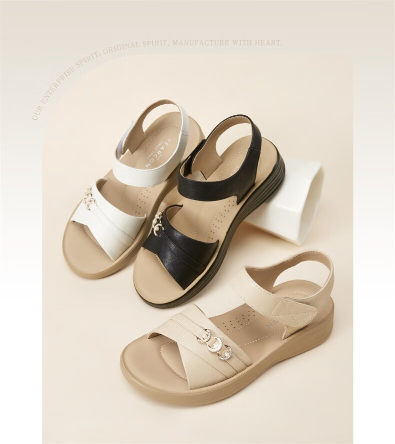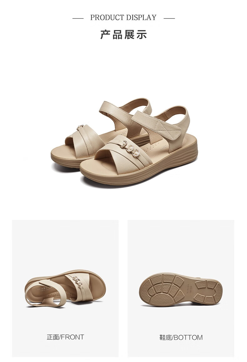 Yierkan Leather Shoes Women's Soft Sole Wedge Flat Shoes Middle-aged Mom Velcro Leather Sandals 11001W Apricot 38