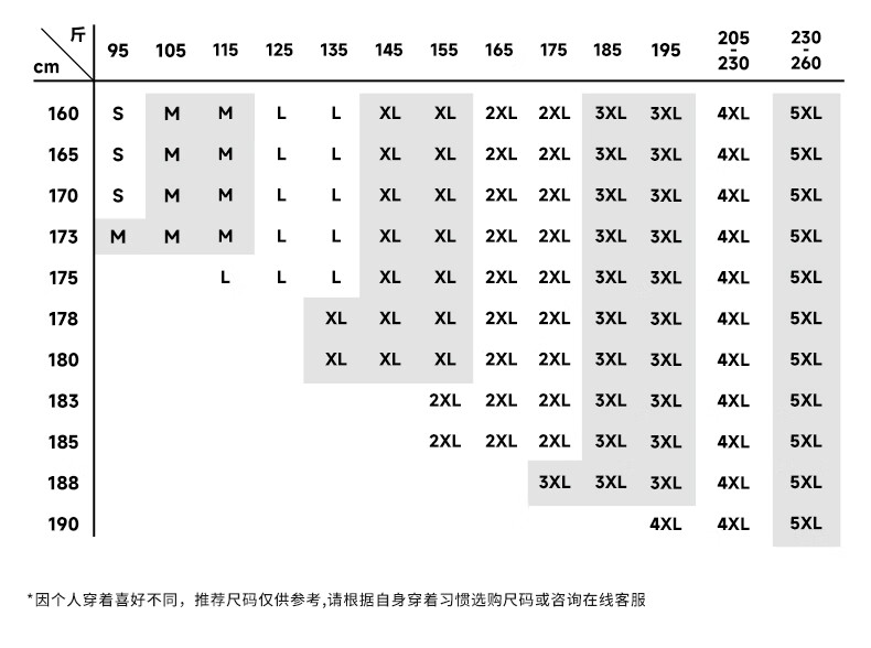 China (cm) 160-165/84-86 165-170 / 88-90 167-172 / 92-96 168-173 / 98-102 170-176 / 106-110