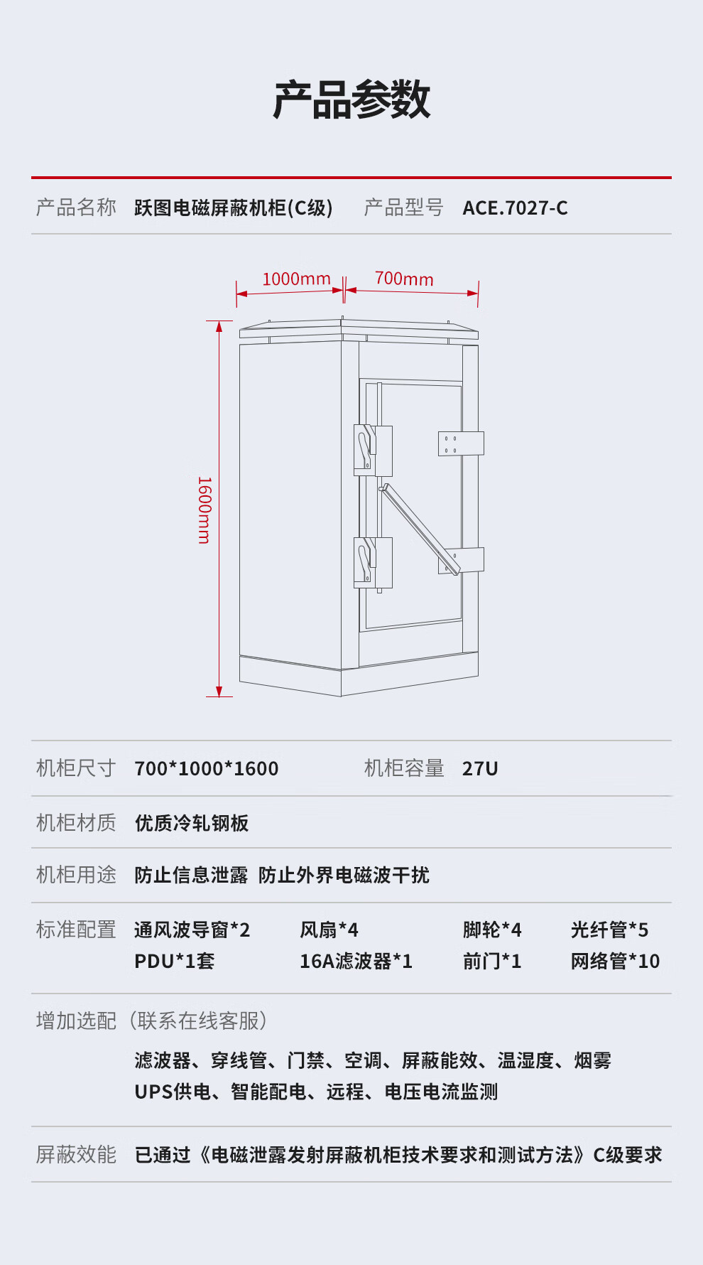 Gabinete de protección electromagnética Yuetu El gabinete de seguridad de red de nivel C 700 * 1000 * 1,6 m 27U evita interferencias electromagnéticas y fugas de información ACE.7027-C